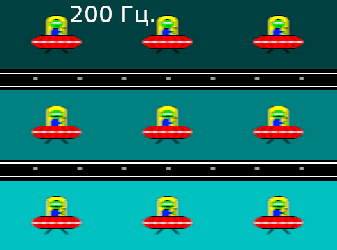 Попробуем представить, что было бы в случае матрицы с мгновенным переключением пикселей. Для нее при 60 Гц объект со скоростью движения 960 пиксель/с размывается на 16 пикселей, при 120 Гц — на 8 пикселей (скорость 960 пиксель/с), при 180 Гц — на 5 пикселей (скорость 900 пиксель/с — при 200 Гц и 1000 пиксель/с на столько же). Размывается, так как фокус зрения движется с указанной скоростью, а объект неподвижно выводится на 1/60, 1/120 или на 1/180 секунды. Для иллюстрации этого сымитируем размытие на перечисленное количество пикселей: