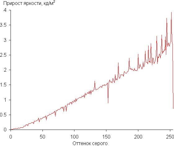 Реальная гамма-кривая ближе всего к стандартной при выборе варианта Гамма 2.2, поэтому далее мы измерили яркость 256 оттенков серого (от 0, 0, 0 до 255, 255, 255) при этом значении. График ниже показывает прирост (не абсолютное значение!) яркости между соседними полутонами: