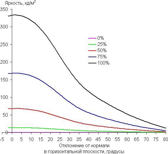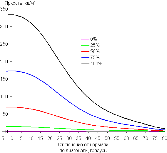 Чтобы выяснить, как меняется яркость экрана при отклонении от перпендикуляра к экрану, мы провели серию измерений яркости черного, белого и оттенков серого в центре экрана в широком диапазоне углов, отклоняя ось датчика в вертикальном, горизонтальном и диагональном (из угла в угол для формата 16:9) направлениях.
