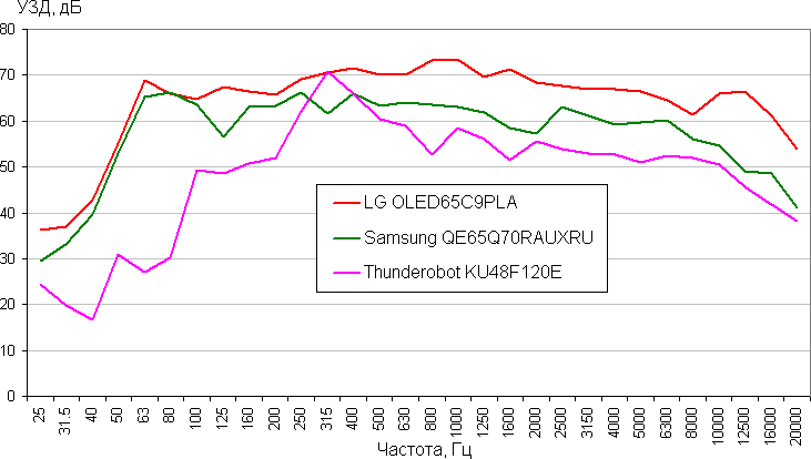 Встроенные громкоговорители звучат согласно их размерам и акустическому окружению — достаточно громко для сидящего перед монитором пользователя, самых низких частот нет, есть заметный «пластиковый» призвук из-за резонансов корпуса, стереофонический эффект выражен очень хорошо. Сравним АЧХ этого монитора с АЧХ двух телевизоров высшего класса (воспроизводился розовый шум, уровни звукового давления в 1/3 октавах записывал шумомер Октава-111):