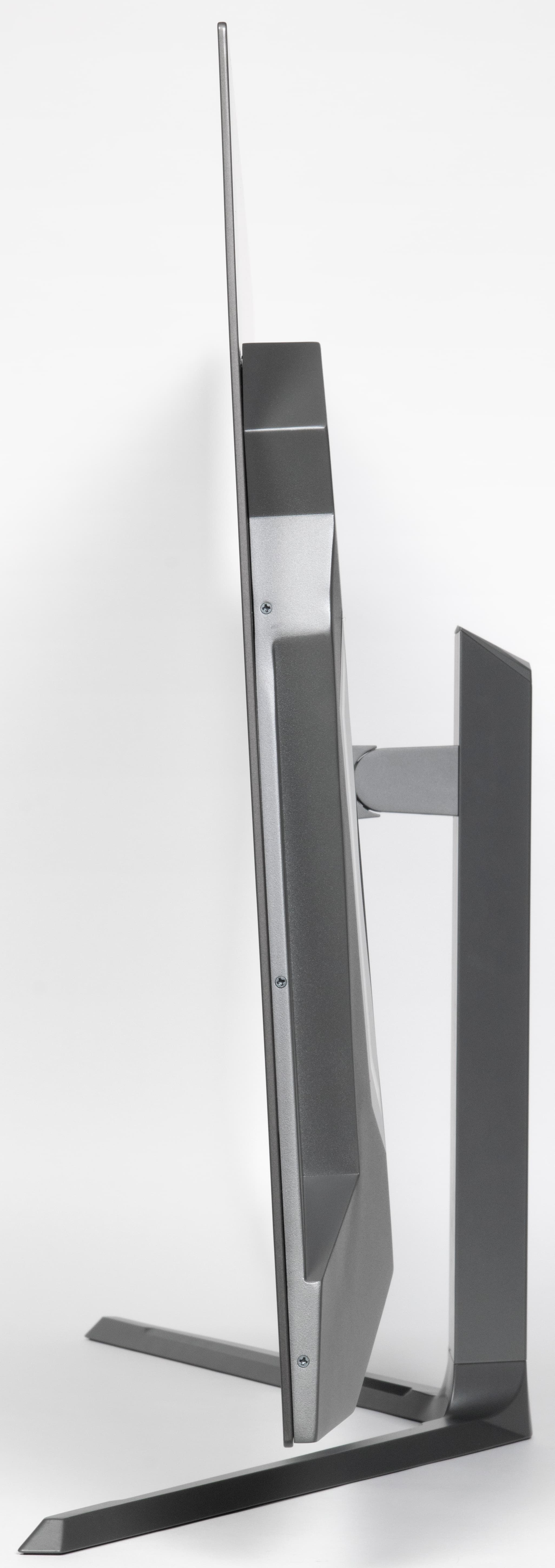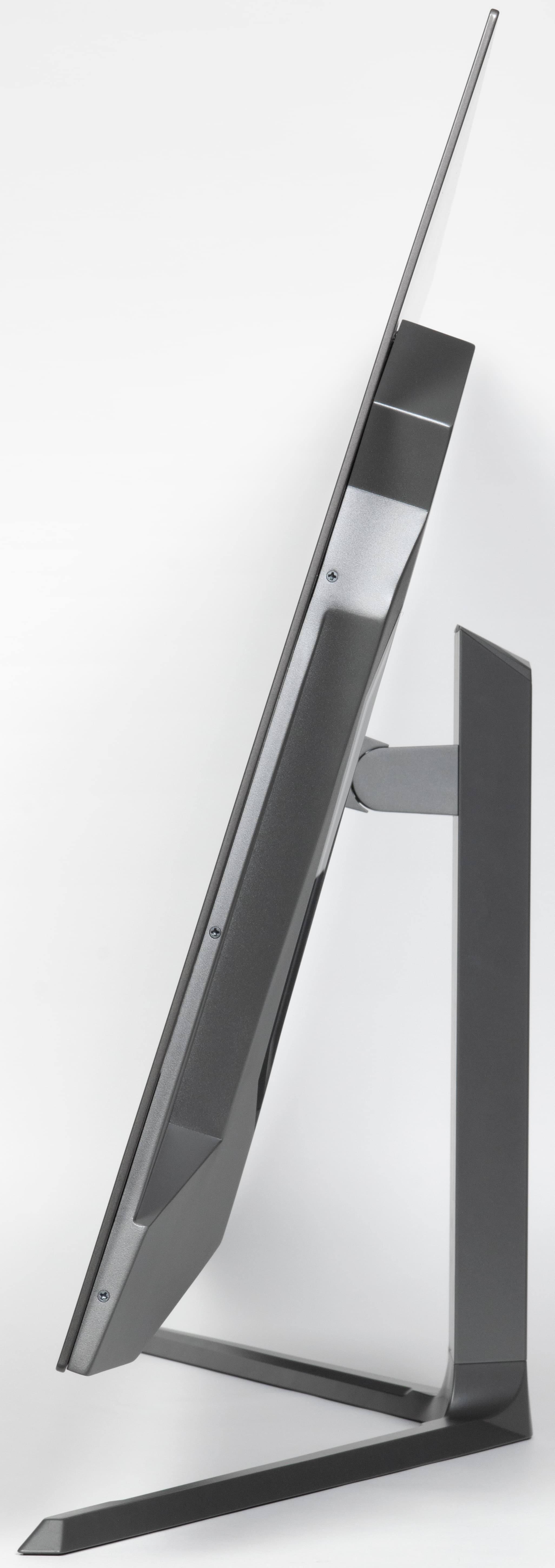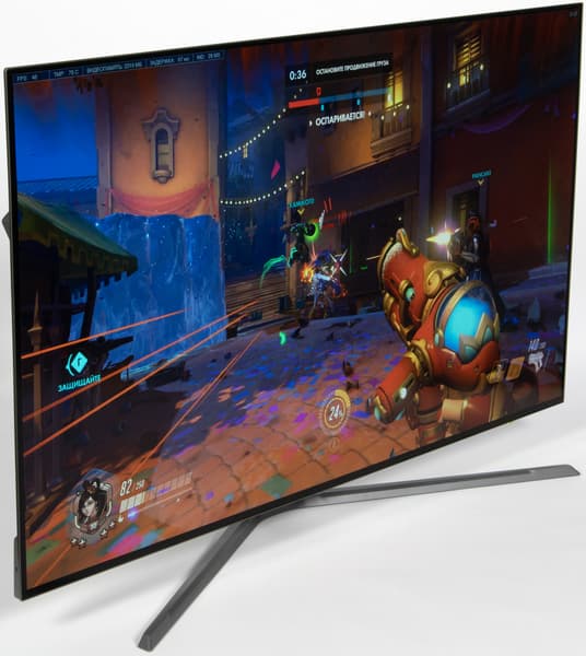 Размеры монитора склоняют воспринимать его как телевизор, а не как монитор. Дизайн в целом строгий, нейтральный. При взгляде спереди игровую направленность монитора ничего не выдает. Даже дизайн подставки типичен скорее для телевизора. Экран выглядит как монолитная поверхность, ограниченная по периметру узкой окантовкой. Выведя изображение на экран, можно увидеть, что на самом деле между внешними границами экрана и собственно областью отображения есть неширокие поля (примерно по 9 мм сверху и по бокам и порядка 12 мм снизу). Внешняя поверхность матрицы жесткая черная полуматовая (зеркальность хорошо выражена; мониторов с по-настоящему матовой — в нашем понимании — поверхностью сейчас на рынке практически нет). Специального антибликового покрытия (фильтра) нет.
