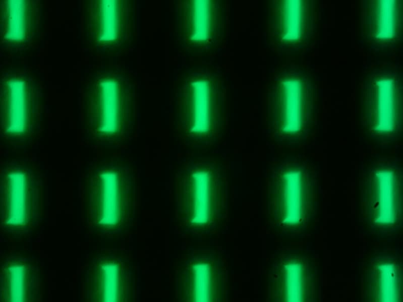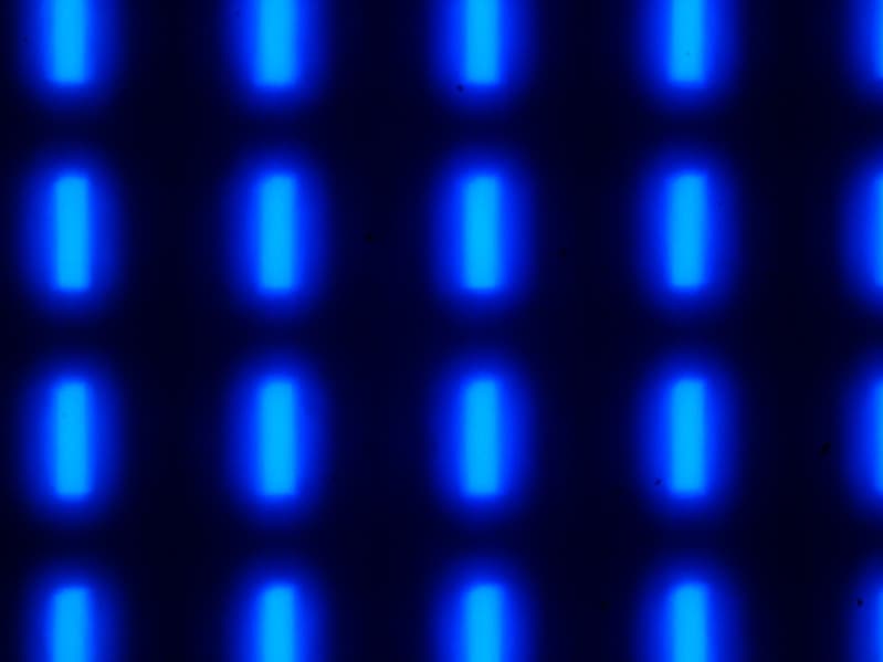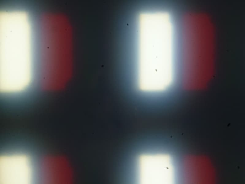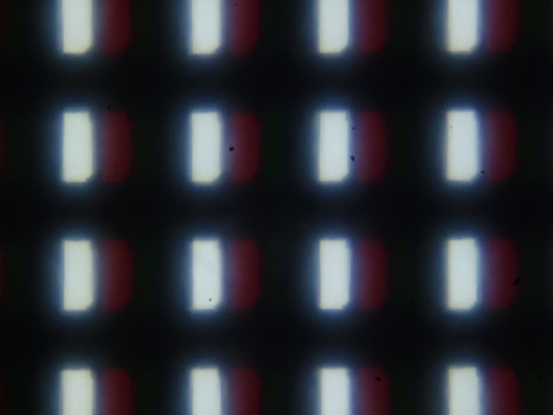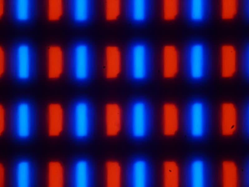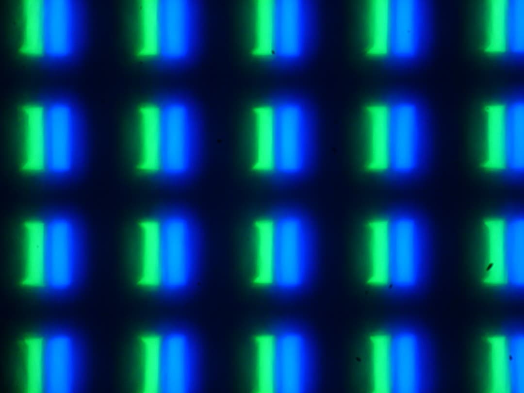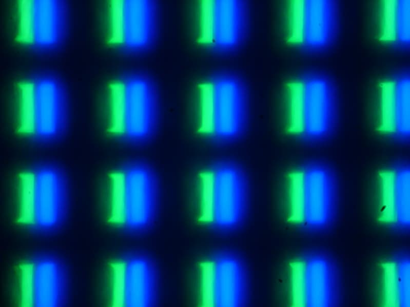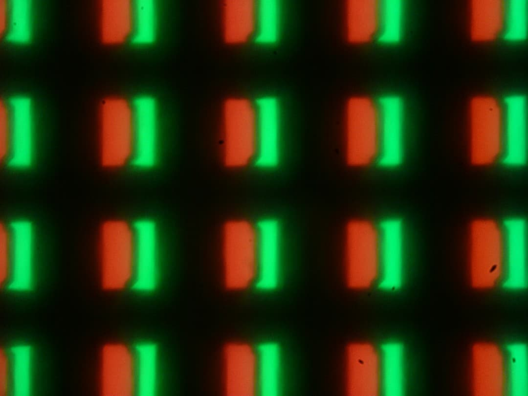 Видно, что светофильтры нанесены вертикальными полосками, как и в случае типичной ЖК-матрицы. При этом белый цвет в случае данного сочетания настроек формируется с участием красного субпикселя. Заметим, что из-за особенностей расположения субпикселей и формирования оттенков желтые объекты с четкими границами на белом фоне слева имеют выраженную красную кайму, а справа — зеленую.