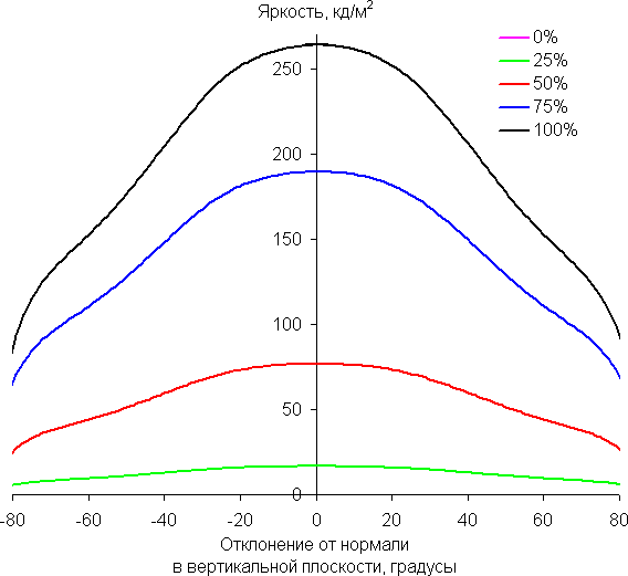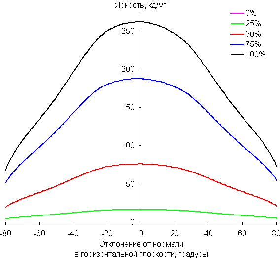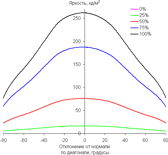 Отметим очень плавное уменьшение яркости при отклонении от перпендикуляра к экрану во всех трех направлениях, при этом графики яркости полутонов не пересекаются во всем диапазоне измеряемых углов. Для сравнения: в случае типичного ЖК-монитора на матрице VA яркость падает вдвое уже примерно при 35°.