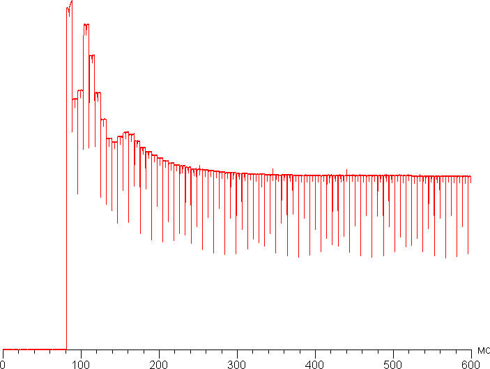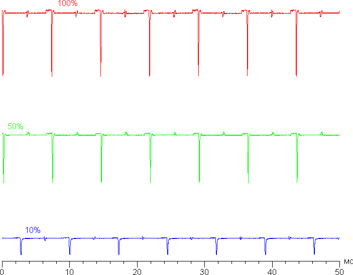 На любом уровне яркости видимое мерцание отсутствует, его не выявляет и тест на стробоскопический эффект. Регистрация зависимости яркости от времени при различных уровнях яркости выявила модуляцию яркости с очень высоким коэффициентом заполнения, что и объясняет отсутствие мерцания. В доказательство приведем графики зависимости яркости (вертикальная ось) от времени (горизонтальная ось) при различных значениях настройки Яркость в случае белого поля на 10% от площади экрана.