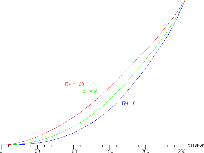 Дополнительной настройкой Выравн. Черного (по умолчанию равна 50) можно скорректировать гамма-кривую, улучшая (или ухудшая) различимость деталей в тенях. Это может быть полезно в играх с темными сценами. Ниже приведены гамма-кривые при трех значениях этой настройки: