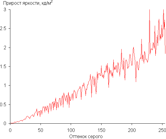Для оценки характера роста яркости мы измерили яркость 256 оттенков серого (от 0, 0, 0 до 255, 255, 255) при выборе профиля Стандарт (Гамма = 2.2, Выравн. Черного = 50) и при последовательном выводе полей на примерно 5% от площади экрана на черном фоне. График ниже показывает прирост (не абсолютное значение!) яркости между соседними полутонами: