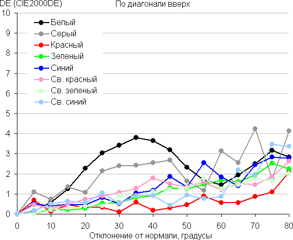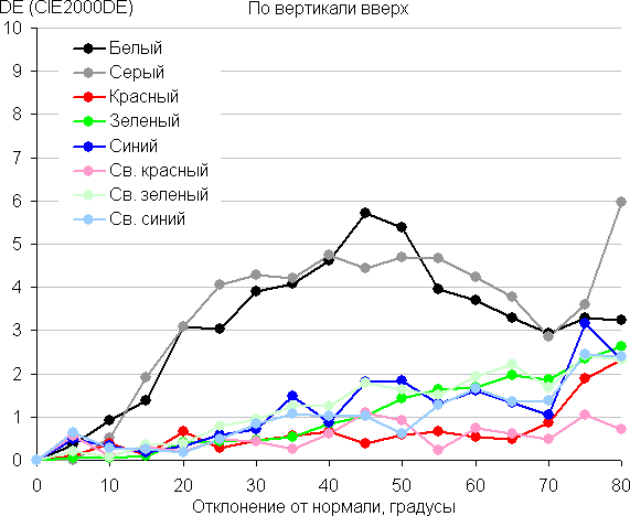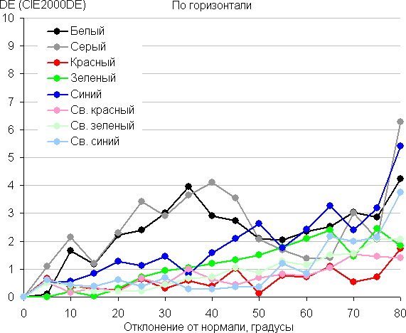Для количественной характеристики изменения цветопередачи мы провели колориметрические измерения для белого, серого (127, 127, 127), красного, зеленого и синего, а также светло-красного, светло-зеленого и светло-синего полей во весь экран с использованием установки, подобной той, что применялась в предыдущем тесте. Измерения проводились в диапазоне углов от 0° (датчик направлен перпендикулярно к экрану) до 80° с шагом в 5°. Полученные значения интенсивностей были пересчитаны в отклонение ΔE относительно замера каждого поля при перпендикулярном положении датчика относительно экрана. Результаты представлены ниже: