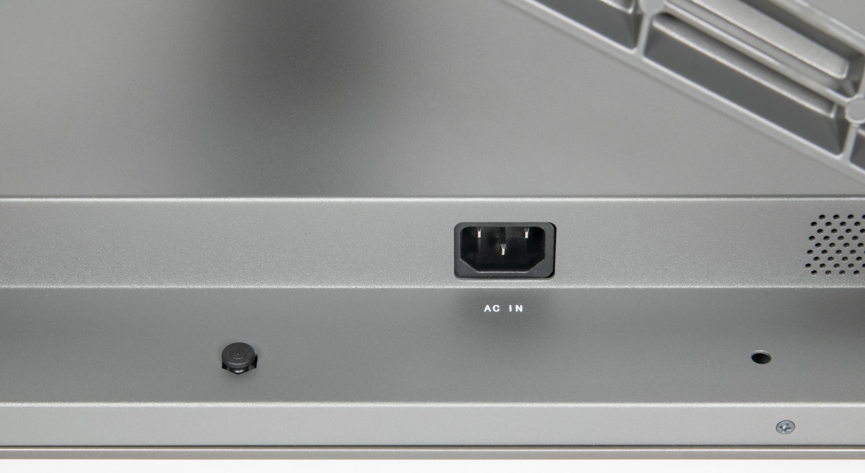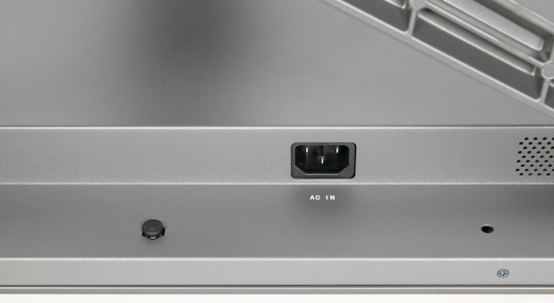 На горизонтальной грани кожуха обращенной вниз, есть разъем питания, а также вентиляционные решетки, за которыми можно рассмотреть встроенные в монитор громкоговорители.