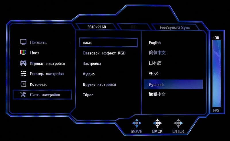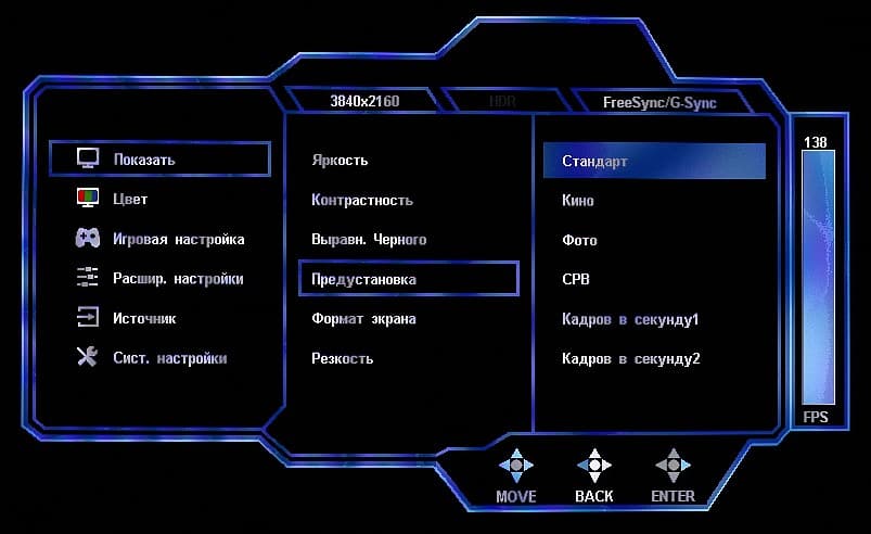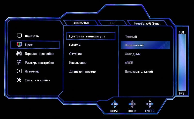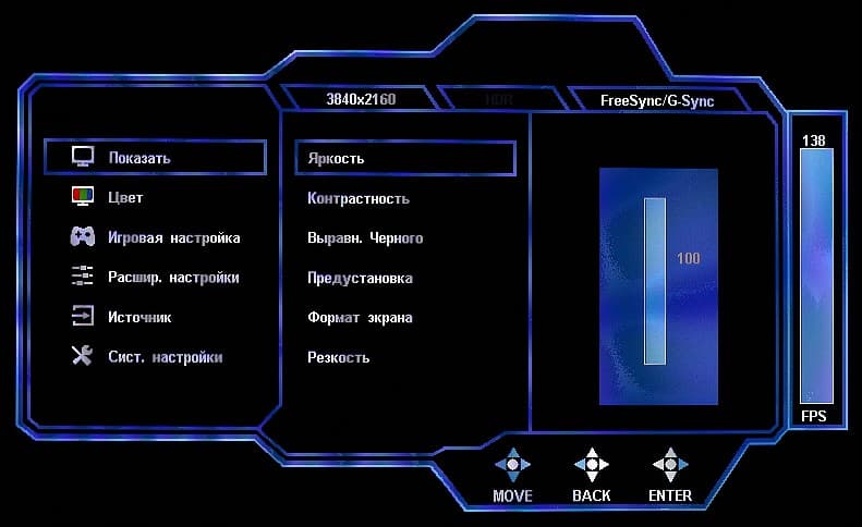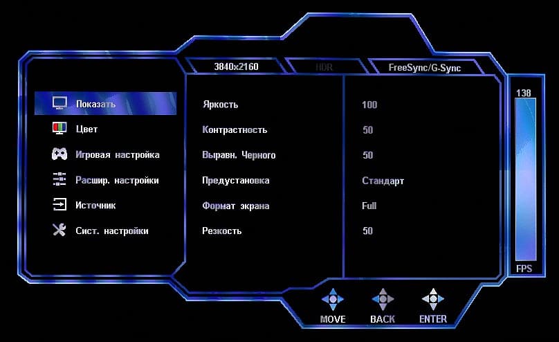 В данном мониторе реализована поддержка технологии FreeSync по входам DisplayPort и HDMI. Диапазон поддерживаемых частот, который указывается на панели настроек видеокарты, равен 48—138 Гц для режимов с частотой обновления 138 Гц. Для визуальной оценки мы использовали описанную в указанной статье тестовую утилиту. Включение FreeSync позволило получить изображение с плавным движением в кадре и без разрывов. С видеокартами Nvidia этот монитор поддерживает G-Sync в режиме G-Sync Compatible также по входам DisplayPort и HDMI. В утилите G-Sync Pendulum Demo режим G-Sync включается, плавность без разрывов присутствует. Проверить вход USB-C на совместимость с FreeSync и G-Sync Compatible возможности не было.