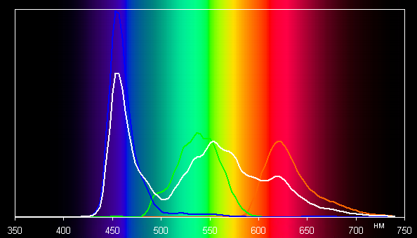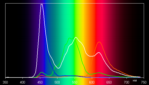 Ниже приведен спектр для белого поля (белая линия), наложенный на спектры красного, зеленого и синего полей (линии соответствующих цветов) в случае исходного цветового охвата: