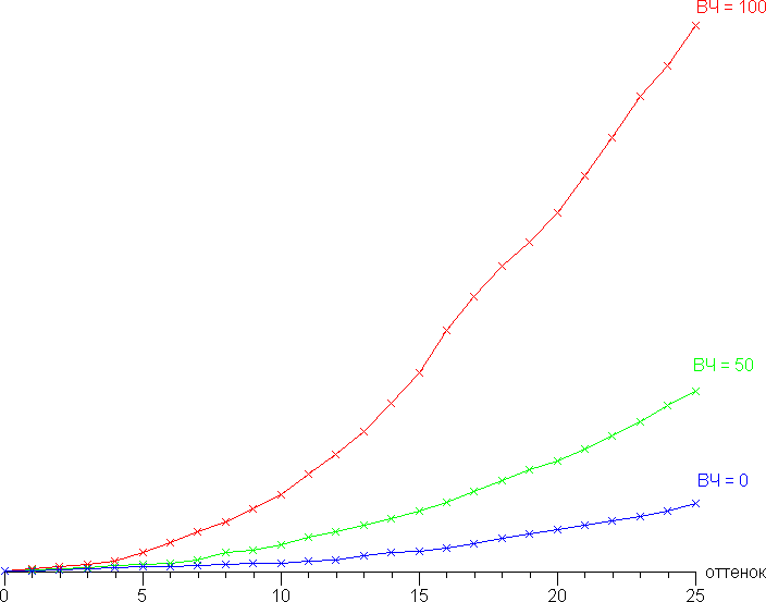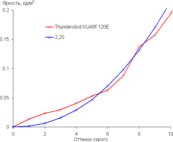 В среднем рост прироста яркости более-менее равномерный, и каждый следующий оттенок значимо ярче предыдущего. В самой темной области аппаратно и визуально различаются все оттенки: