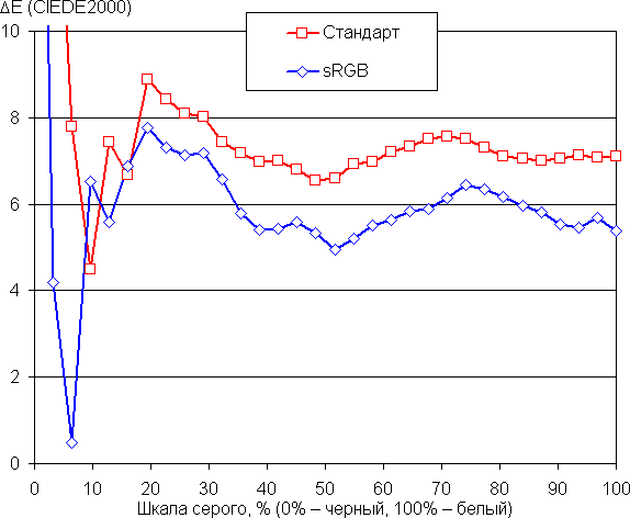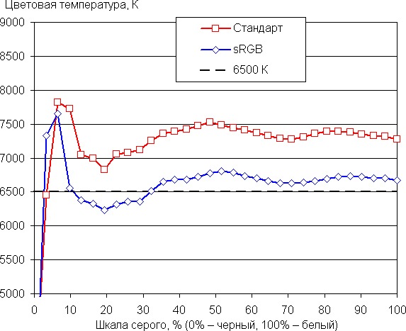 Цветовой баланс просто при выборе профиля Стандарт в списке Диапазон цветов приемлемый, так как цветовая температура не сильно выше стандартных 6500 К, а отклонение от спектра абсолютно черного тела (параметр ΔE) ниже 10 единиц, что для потребительского (и игрового) устройства считается хорошим показателем. При этом оба параметра мало изменяются на различных участках шкалы серого, что улучшает визуальное восприятие цветового баланса. После выбора профиля sRGB цветовой баланс заметно улучшается. Графики ниже показывают цветовую температуру на различных участках шкалы серого и отклонение от спектра абсолютно черного тела (параметр ΔE) в случае профиля Стандарт с настройками по умолчанию и при выборе профиля sRGB: