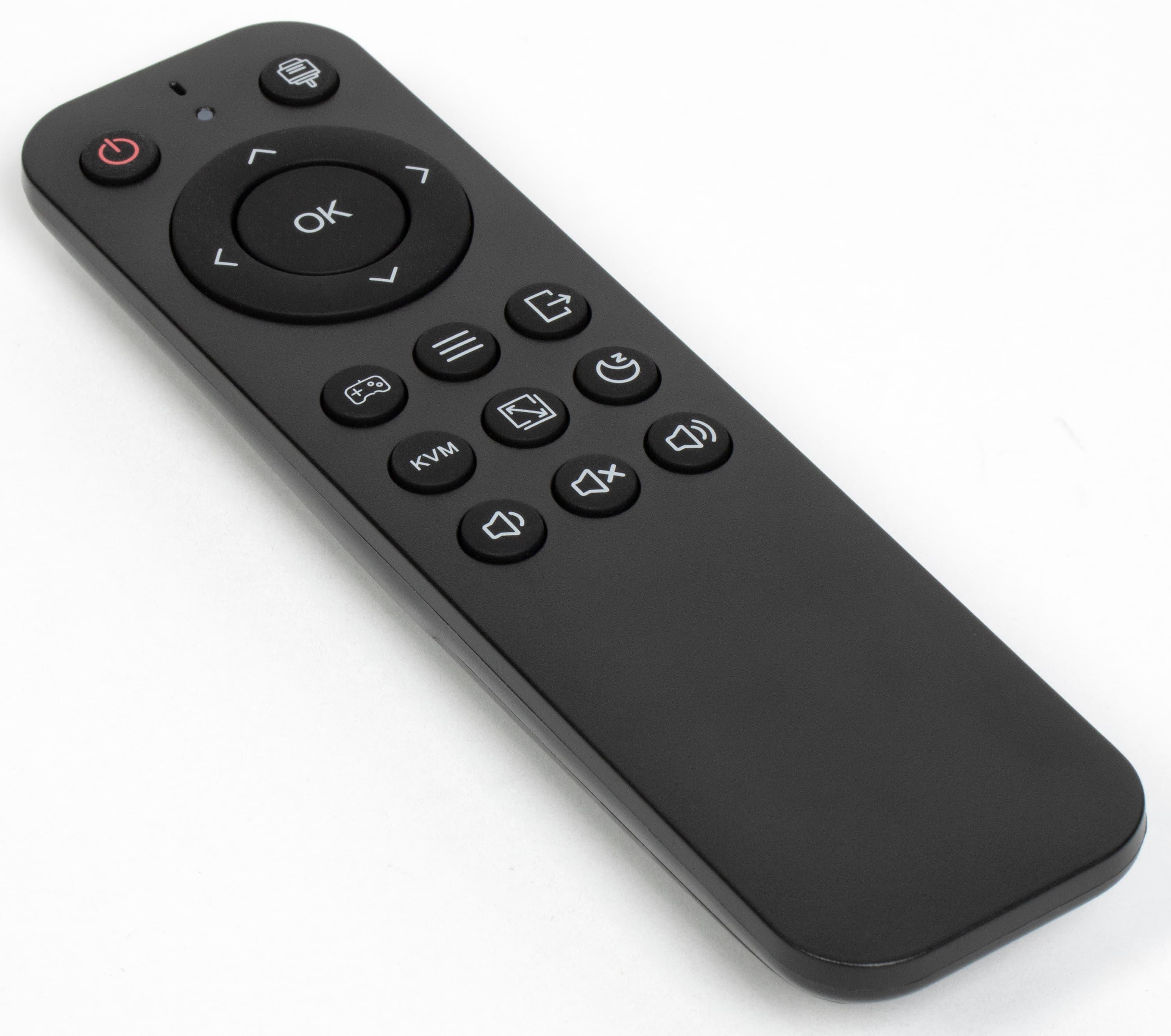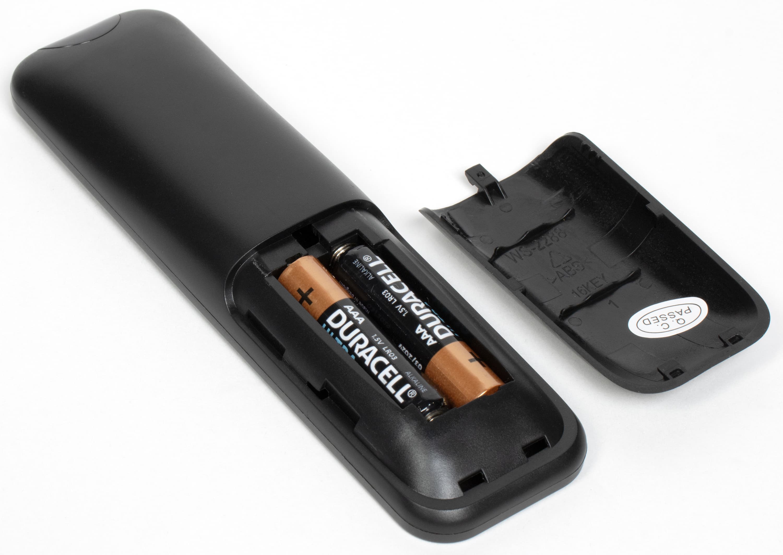 Корпус пульта изготовлен из черного пластика с матовой поверхностью. Во время отправки команд индикатор в передней части пульта мигает красным. Работает пульт от двух элементов питания типа AAA.