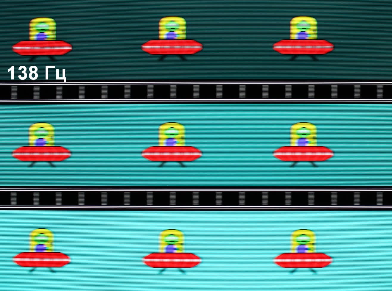 Для наглядного представления о том, что на практике означает такая скорость матрицы приведем серию снимков, полученных с помощью движущейся камеры. Такие снимки показывают, что видит человек, если он следит глазами за двигающимся на экране объектом. Описание теста приведено тут, страница с самим тестом тут. Использовались рекомендованные установки (скорость движения 960, 1000 и 966 пиксель/с для частот обновления 60 (и 120), 100 и 138 Гц, соответственно), выдержка 1/15 с, на фотографиях указаны значения частоты обновления.