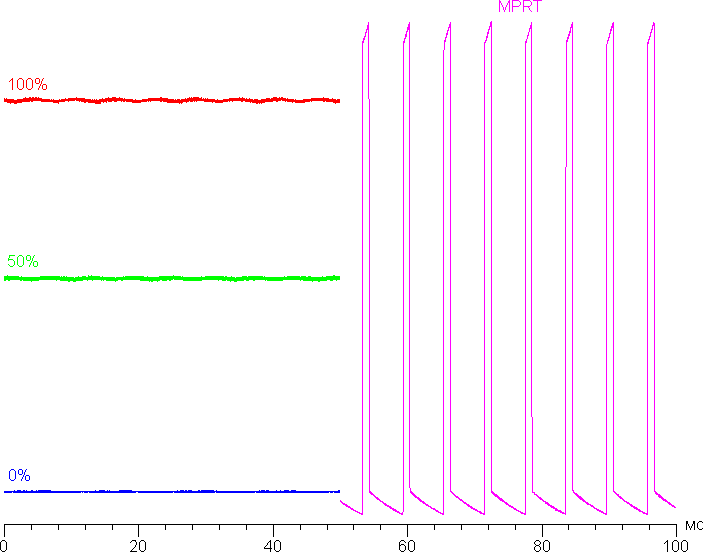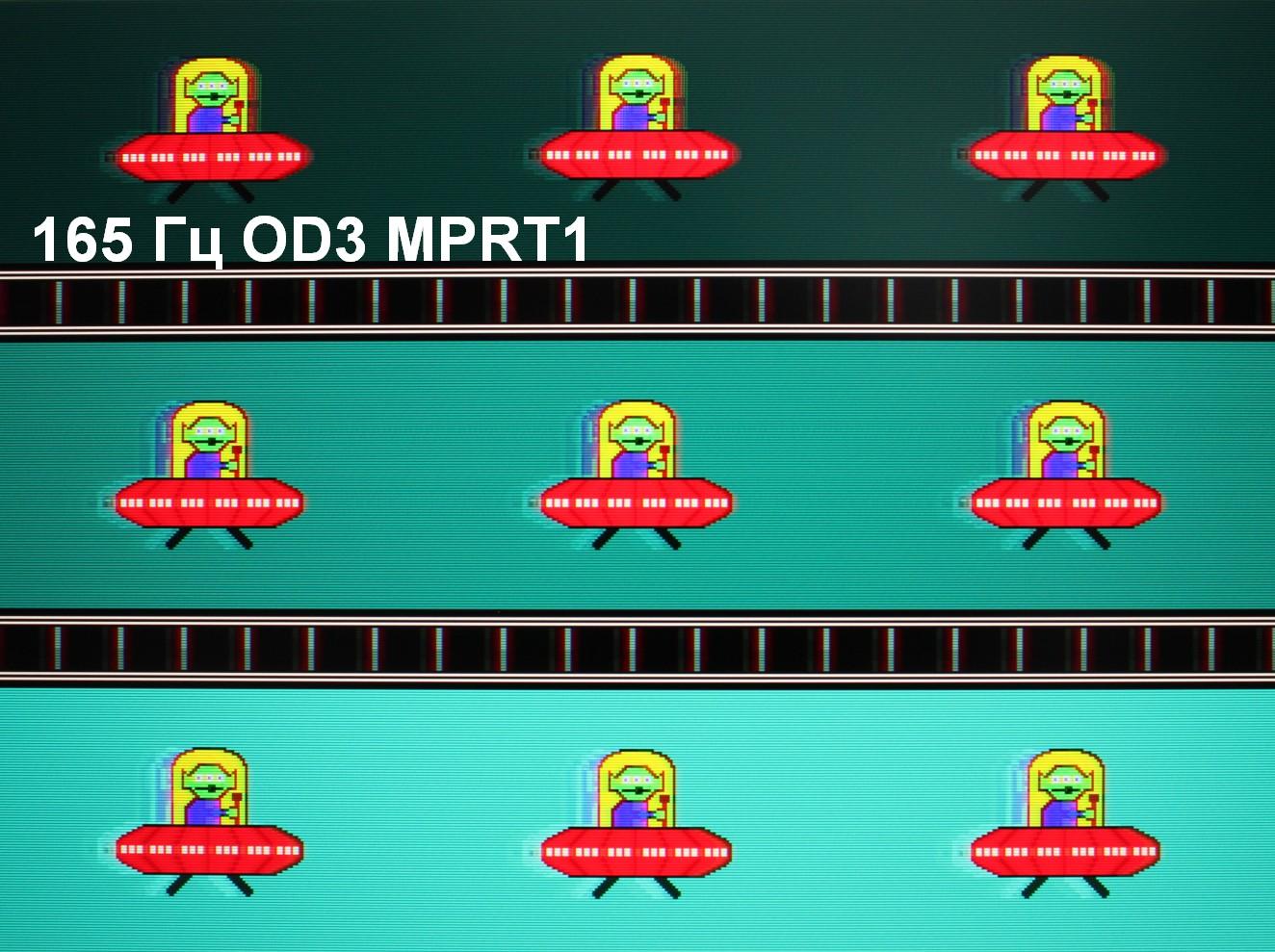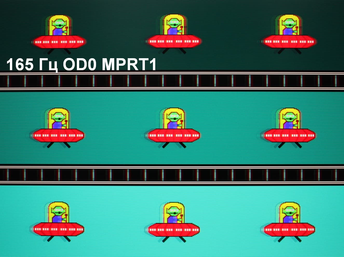 Есть режим со вставкой темного кадра (черным он в данном случае не является) с названием MPRT. Зависимости яркости (вертикальная ось) от времени (горизонтальная ось) когда эта функция включена приведена на правой половине рисунка выше. Четкость в движении действительно повышается, но на динамичной картинке появляются артефакты, о чем будет рассказано ниже, а из-за мерцания с частотой максимум в 165 Гц данный режим рекомендуется использовать с осторожностью, так как мерцание может приводить к повышенной утомляемости глаз. К тому же при включении этого режима сильно снижается яркость (до 90 кд/м²), что также снижает его ценность.