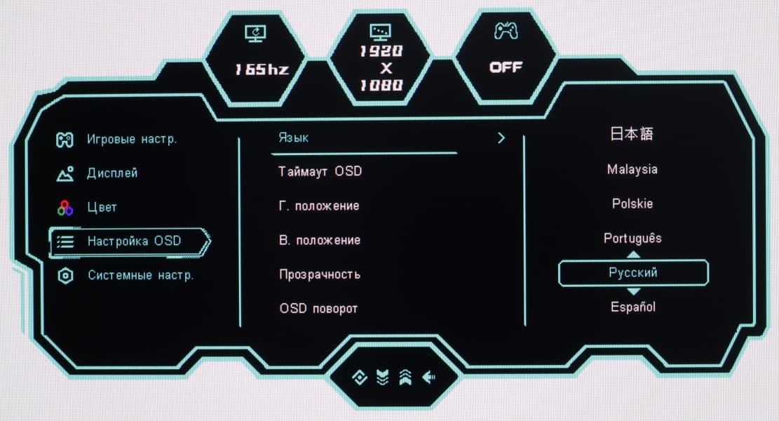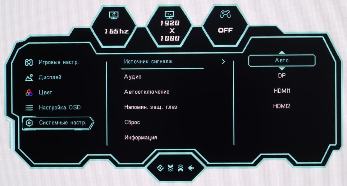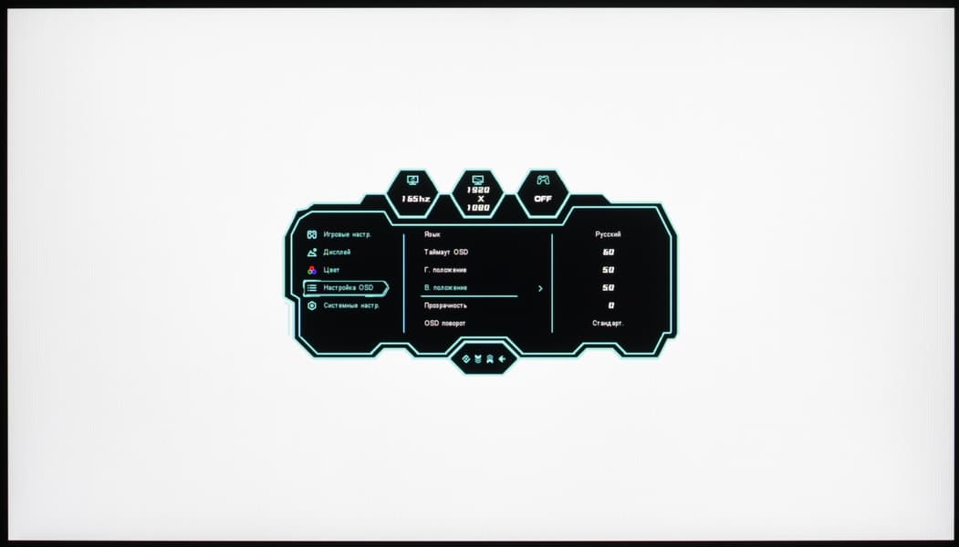 Индикатор питания неярко светится синим при работе, красным в режиме ожидания, и не горит, если монитор условно выключен. При работе монитора нажатие на кнопку питания (нижняя) выключает монитор, также одного нажатия достаточно для включения. При нажатии на первую кнопку, если сверху вниз, на экран выводится основное меню с настройками; на вторую — короткое меню вывода прицела; на третью — выбора профиля; на четвертую — выбора входа. Меню достаточно крупное, надписи читаемые (белое поле — вся область отображения):
