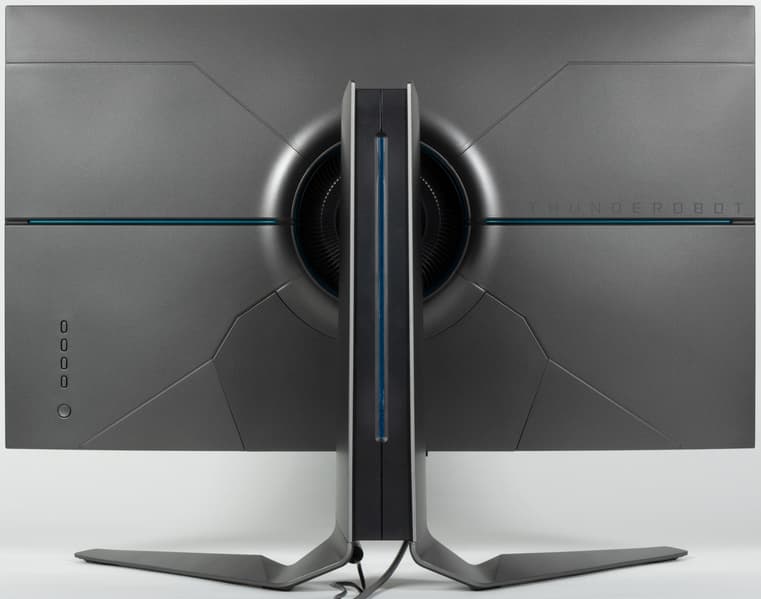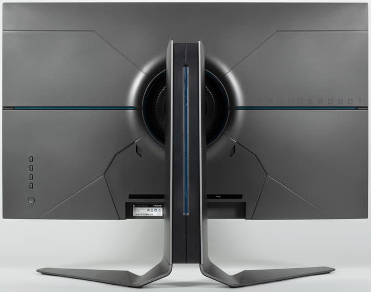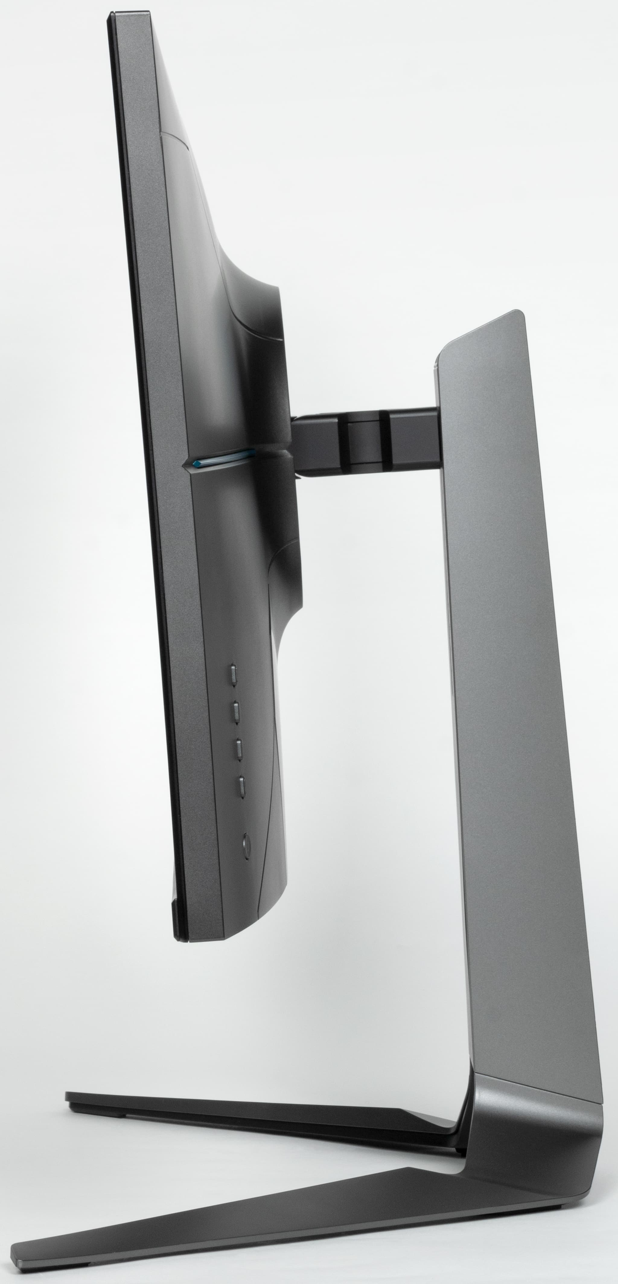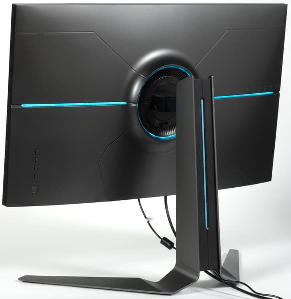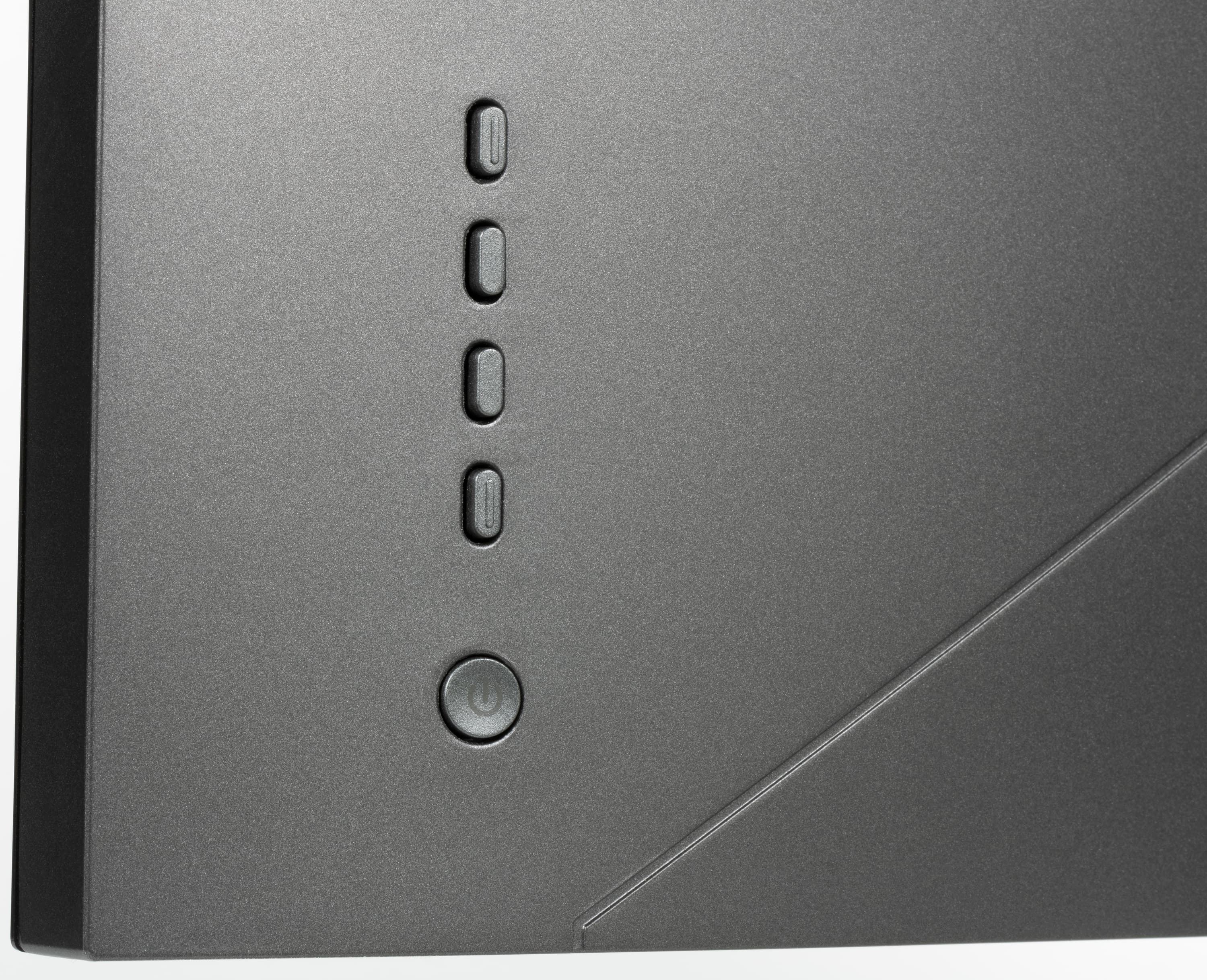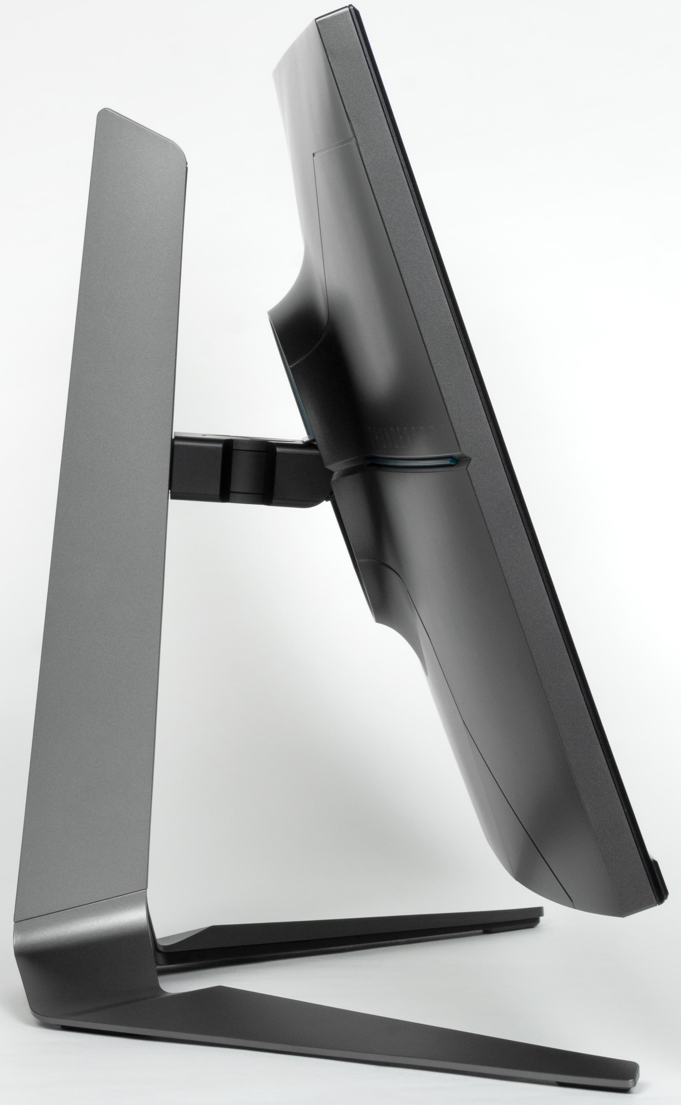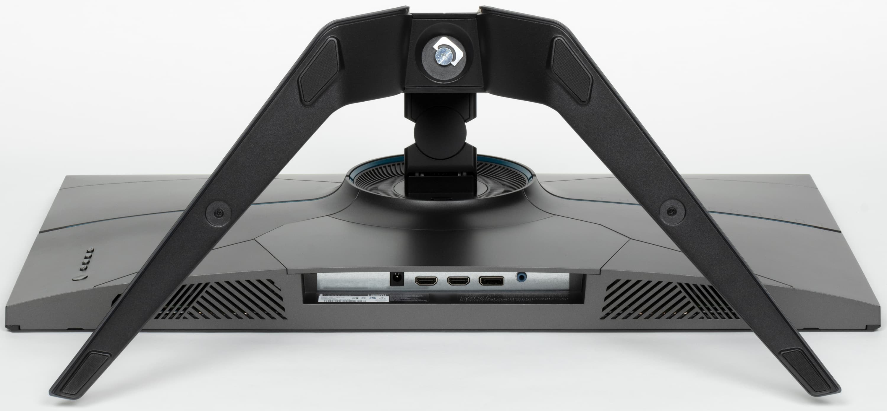 Дизайн строгий, игровую направленность в явном виде ничего не выдает. Панели блока экрана и кожухи подставки изготовлены из черного или серо-серебристого снаружи пластика с матовой поверхностью. Внешняя поверхность матрицы черная, полуматовая (зеркальность хорошо выражена), внешний слой матрицы жесткий. Спереди экран выглядит как монолитная поверхность, ограниченная снизу неширокой планкой, а по периметру — узкой окантовкой. Выведя изображение на экран, можно увидеть, что на самом деле между внешними границами экрана и собственно областью отображения есть неширокие поля.