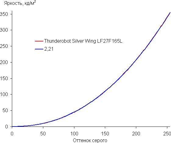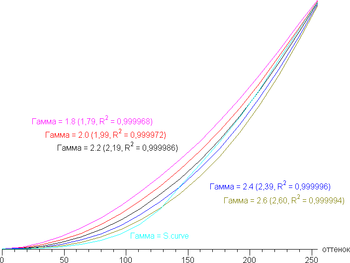 Реальная гамма-кривая зависит от выбранного профиля в списке Гамма (значения показателей аппроксимирующей функции приведены в скобках в подписях, там же — коэффициент детерминации):