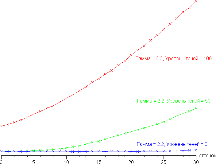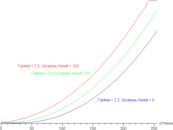Дополнительной настройкой Уровень теней (значения от 0 до 100, с шагом 1, по умолчанию 50) можно скорректировать гамма-кривую, улучшая (>50) или ухудшая (<50) различимость деталей в тенях. Первое может быть полезно в играх с темными сценами. Ниже приведены гамма-кривые при трех значениях этой настройки:
