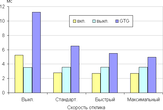 Время отклика зависит от значения настройки Скорость отклика, которая управляет разгоном матрицы. График ниже показывает, как меняется время включения и выключения при переходе черный-белый-черный (столбики «вкл.» и «выкл.»), а также среднее суммарное время для переходов между полутонами (столбики GTG) в случае режима с частотой обновления 165 Гц для четырех значений этой настройки: