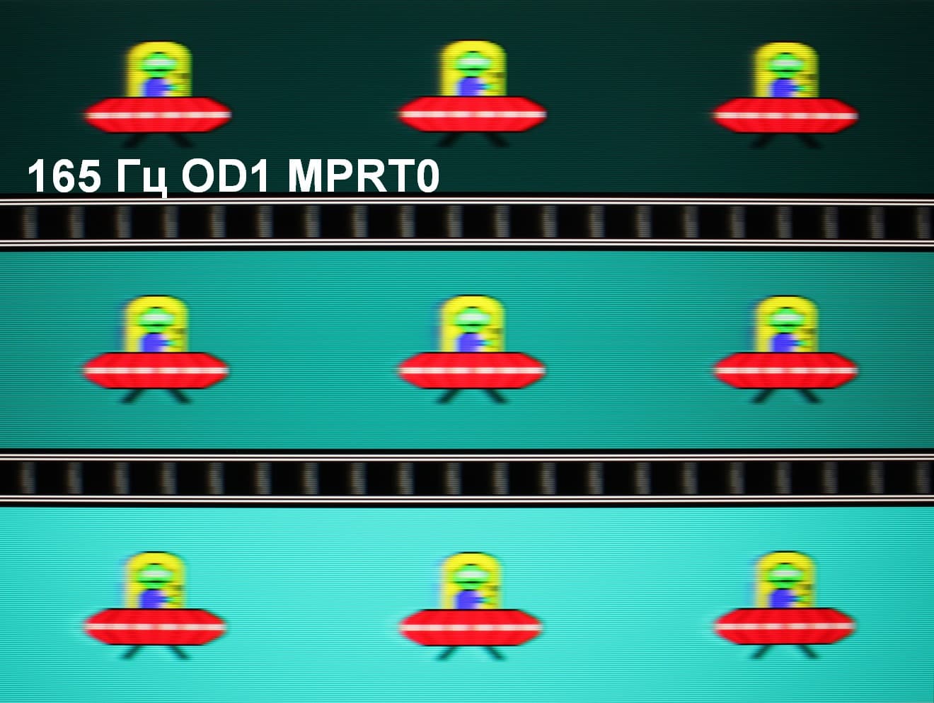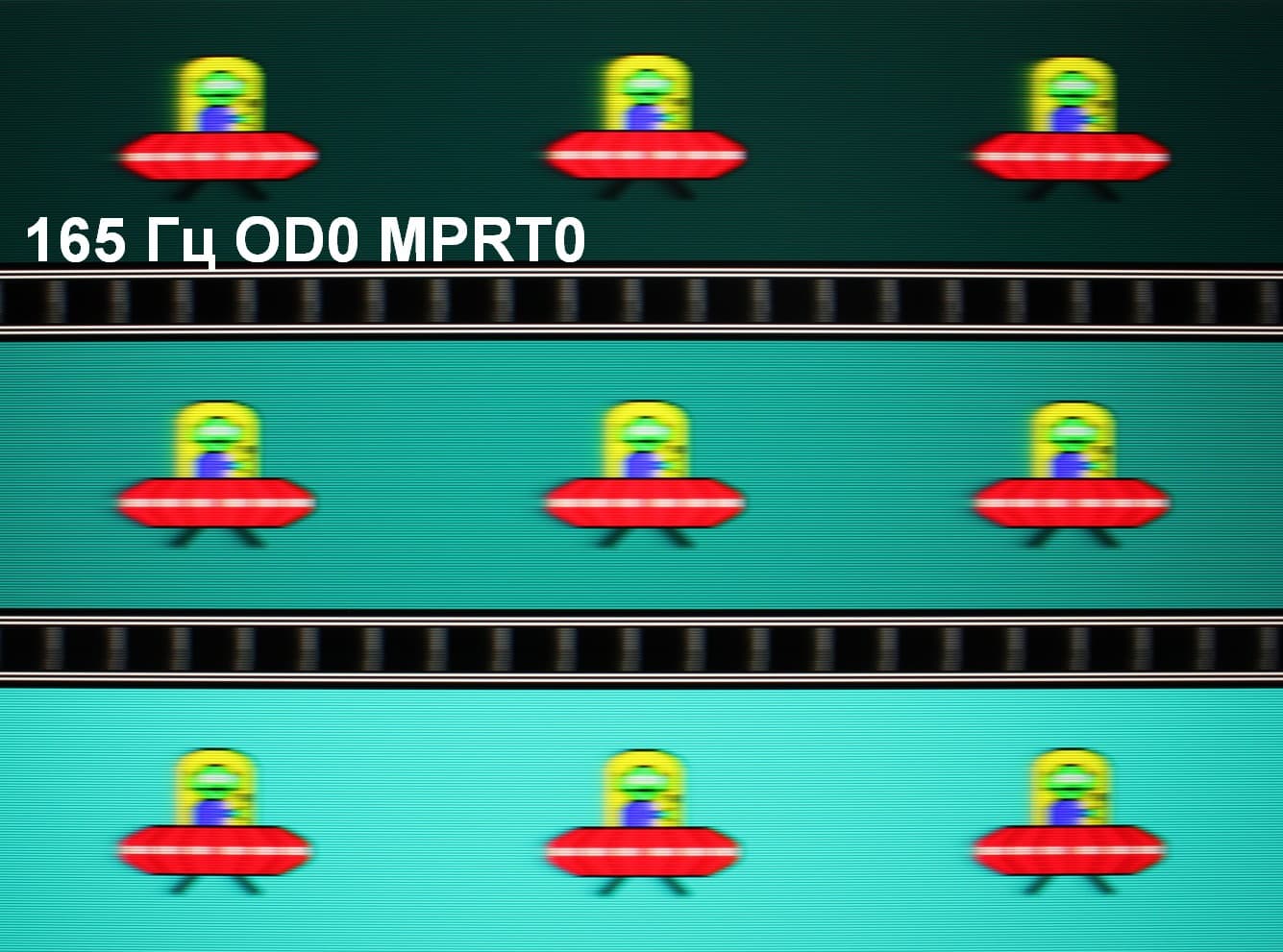 Для наглядного представления о том, что на практике означает такая скорость матрицы, и какие могут быть артефакты от разгона, приведем серию снимков, полученных с помощью движущейся камеры. Такие снимки показывают, что видит человек, если он следит глазами за двигающимся на экране объектом. Описание теста приведено тут, страница с самим тестом тут. Использовались рекомендованные установки (скорость движения 960 пиксель/с для частот обновления 60 и 120 Гц или 990 пиксель/с для 165 Гц, то есть на целое число пикселей за кадр), выдержка 1/15 с. На фотографиях указаны значения частоты обновления, а также включен ли разгон (ODx; x = 0 — 3) и режим вставки темного кадра (MPRTx; x = 0 — выключен, x = 1 — включен).