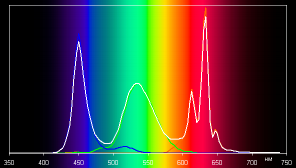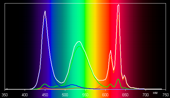 Ниже приведен спектр для белого поля (белая линия), наложенный на спектры красного, зеленого и синего полей (линии соответствующих цветов), когда в явном виде нет корректировки цветового охвата
