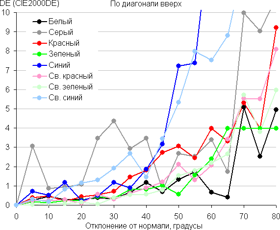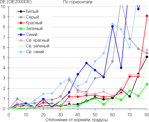 Для количественной характеристики изменения цветопередачи мы провели колориметрические измерения для белого, серого (127, 127, 127), красного, зеленого и синего, а также светло-красного, светло-зеленого и светло-синего полей во весь экран с использованием установки, подобной той, что применялась в предыдущем тесте. Измерения проводились в диапазоне углов от 0° (датчик направлен перпендикулярно к экрану) до 80° с шагом в 5°. Полученные значения интенсивностей были пересчитаны в ΔE относительно замера каждого поля при перпендикулярном положении датчика относительно экрана. Результаты представлены ниже: