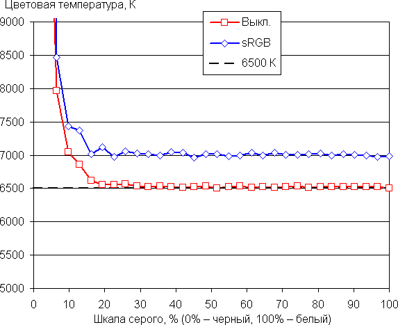 Цветовой баланс просто при выборе одного из трех профилей Польз. 1-3 (и без коррекции) для настройки Цвет, которые по умолчанию обеспечивают максимальную яркость и контрастность с сохранением приемлемого качества изображения, приемлемый, так как цветовая температура очень близка к стандартным 6500 К и отклонение от спектра абсолютно черного тела (параметр ΔE) ниже 10 единиц, что для потребительского устройства считается хорошим показателем. При выборе профиля sRGB цветовой баланс чуть хуже, но все равно остается приемлемым для непрофессиональной работы с цветом. Графики ниже показывают цветовую температуру на различных участках шкалы серого и ΔE: