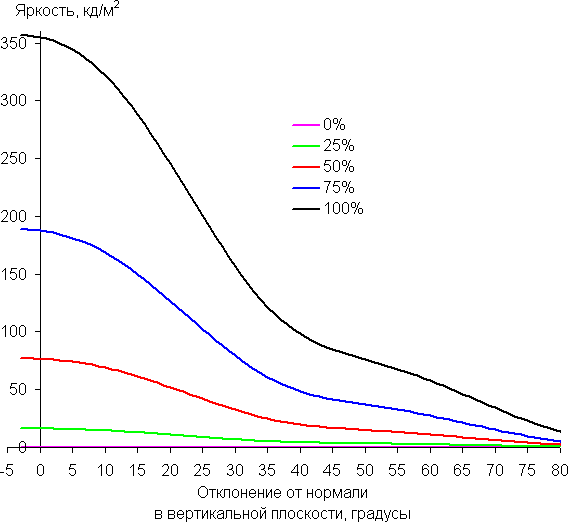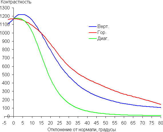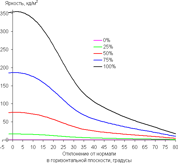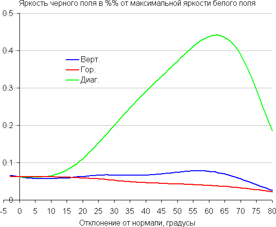 По скорости падения яркости углы обзора неширокие. Отметим примерно одинаковый характер уменьшения яркости при отклонении от перпендикуляра к экрану во всех трех направлениях, при этом графики не пересекаются в значимом диапазоне измеряемых углов. При отклонении в диагональном направлении яркость черного поля начинает резко возрастать уже при 20° отклонения от перпендикуляра к экрану. Если сидеть не очень далеко от экрана, то черное поле по углам будет заметно светлее, чем в центре (оставаясь примерно нейтрально-серым по оттенку). Однако яркость черного поля при отклонении от перпендикуляра к экрану возрастает всего до примерно 0,45% от максимальной яркости белого поля и только при большом отклонении. Для матрицы типа IPS это очень хороший результат. Контрастность в диапазоне углов ±82° приближается к отметке 10:1 только при отклонении по диагонали, но все равно остается выше этого значения.