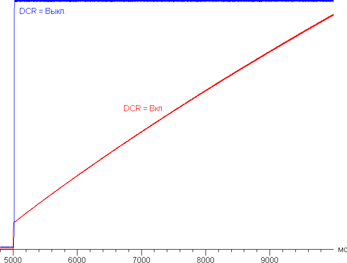 При включении режима с динамическим управлением яркости установившаяся контрастность формально возрастает до бесконечности, так как на черном поле во весь экран подсветка выключается совсем после примерно 11 секунд с момента переключения с белого поля на черное поле. График ниже показывает, как увеличивается яркость (вертикальная ось) при переключении с черного поля (после пяти секунд вывода) на белое при выключенной и включенной динамической подстройке яркости: