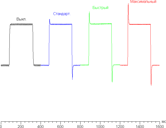 При включении разгона на графиках некоторых переходов появляются характерные всплески яркости. Ниже приведены графики полутонового перехода между оттенками 70% и 90% и обратно для четырех значений этой настройки (по вертикали — яркость, по горизонтали — время, для наглядности графики выстроены последовательно):
