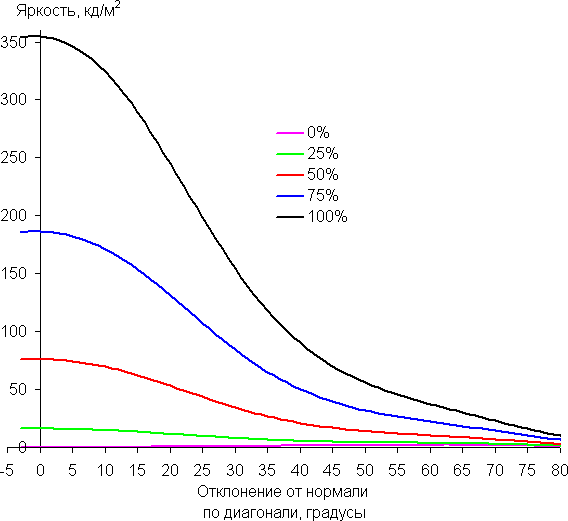 Чтобы выяснить, как меняется яркость экрана при отклонении от перпендикуляра к экрану, мы провели серию измерений яркости черного, белого и оттенков серого в центре экрана в широком диапазоне углов, отклоняя ось датчика в вертикальном, горизонтальном и диагональном (из угла в угол для формата 16:9) направлениях.