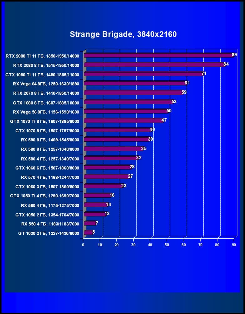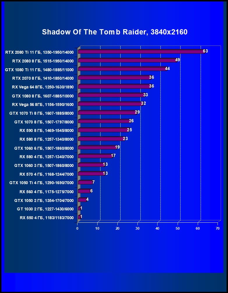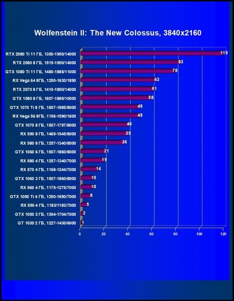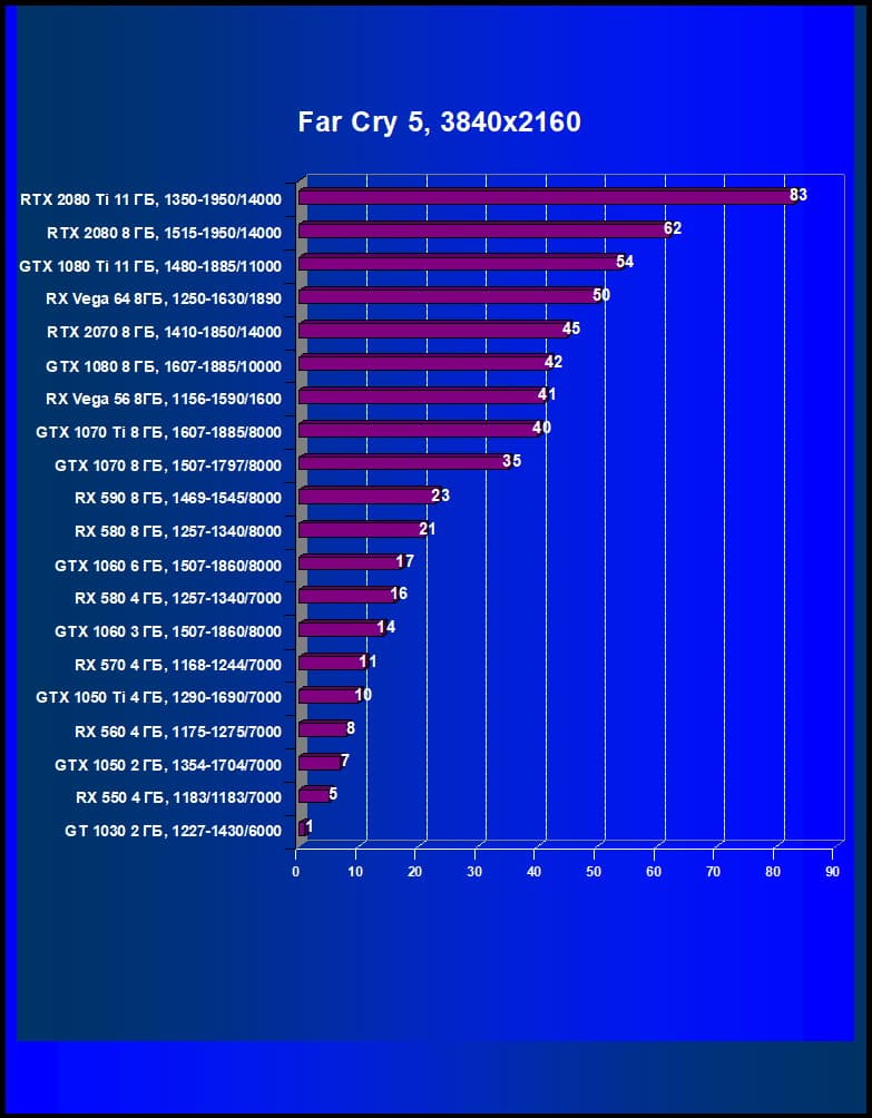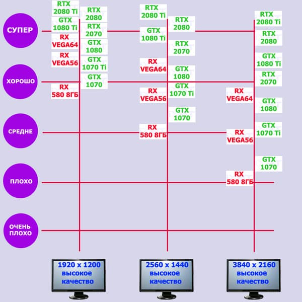 Лучший ускоритель для разрешения 4К (при максимальном качестве графики) — GeForce RTX 2080 Ti, обеспечивающий высокий уровень комфорта во всех играх. Чуть ниже — GeForce RTX 2080, также обеспечивающий хорошую играбельность в 4К. Флагман предыдущего поколения GeForce GTX 1080 Ti больше предназначен для 2560×1440, но многие игры и в 4К отлично идут на нем без снижения качества графики. Для разрешения 2.5К (при максимальном качестве) подойдут GeForce RTX 2070, Radeon RX Vega 64, а также GeForce GTX 1080. А если пользователь согласен понизить уровень качества, то для такого разрешения годятся и Radeon RX 580 8 ГБ, GeForce GTX 1070 Ti, GeForce GTX 1070, которые к тому же отлично справятся с Full HD (или 1920×1200) на максимальных настройках. Менее производительные карты уже не тянут разрешение Full HD при максимальном качестве, а значит, придется понижать качество картинки.