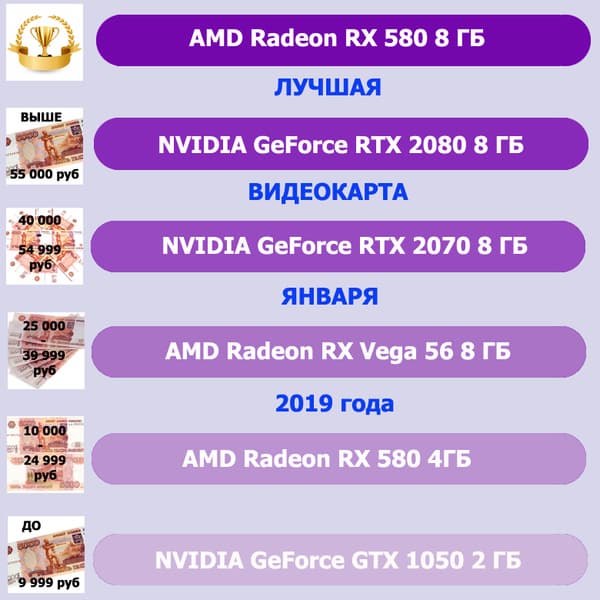 Если в предыдущем выпуске на этом месте был GeForce RTX 2080 Ti, то из-за падения курса рубля и из-за некоторого дефицита карт нового поколения рублевые цены на RTX-семейство немного выросли и RTX 2080 стал дороже 55 тысяч рублей. А он выгоднее, чем его старший брат.