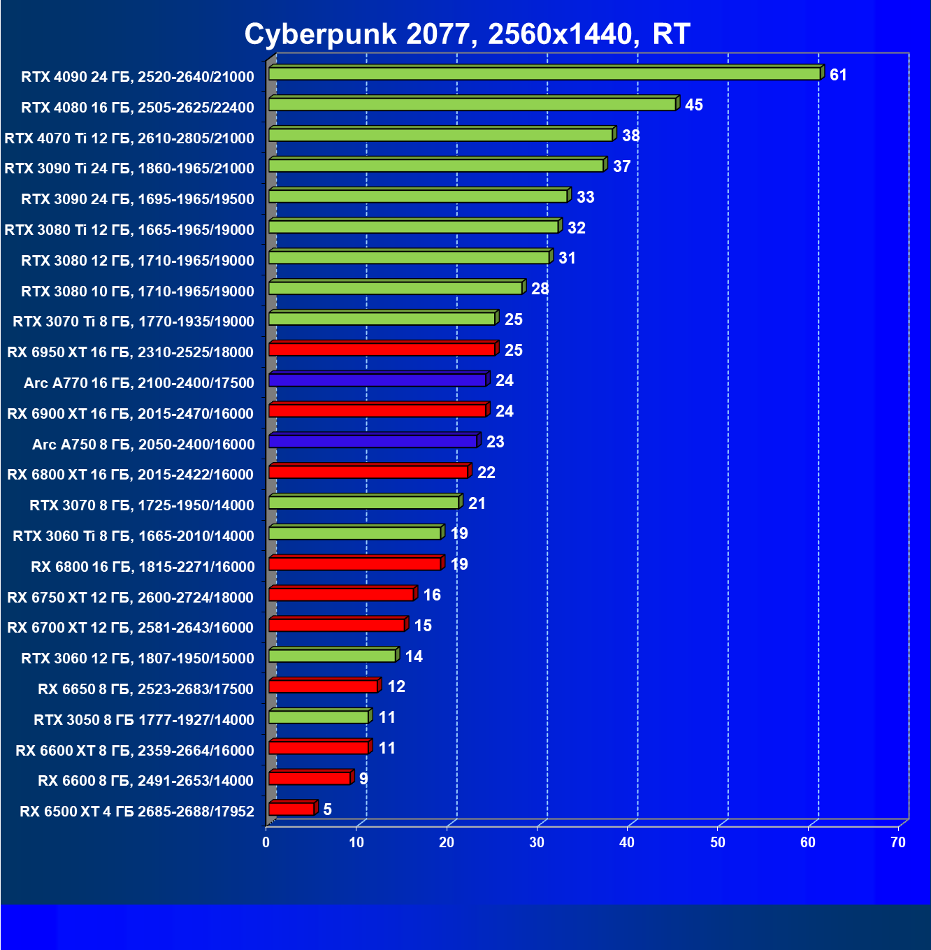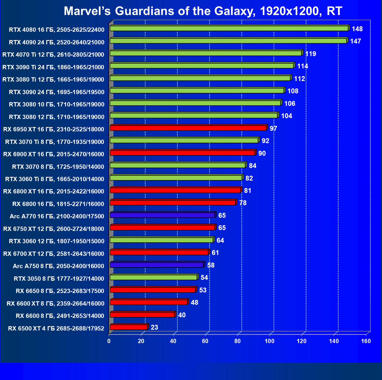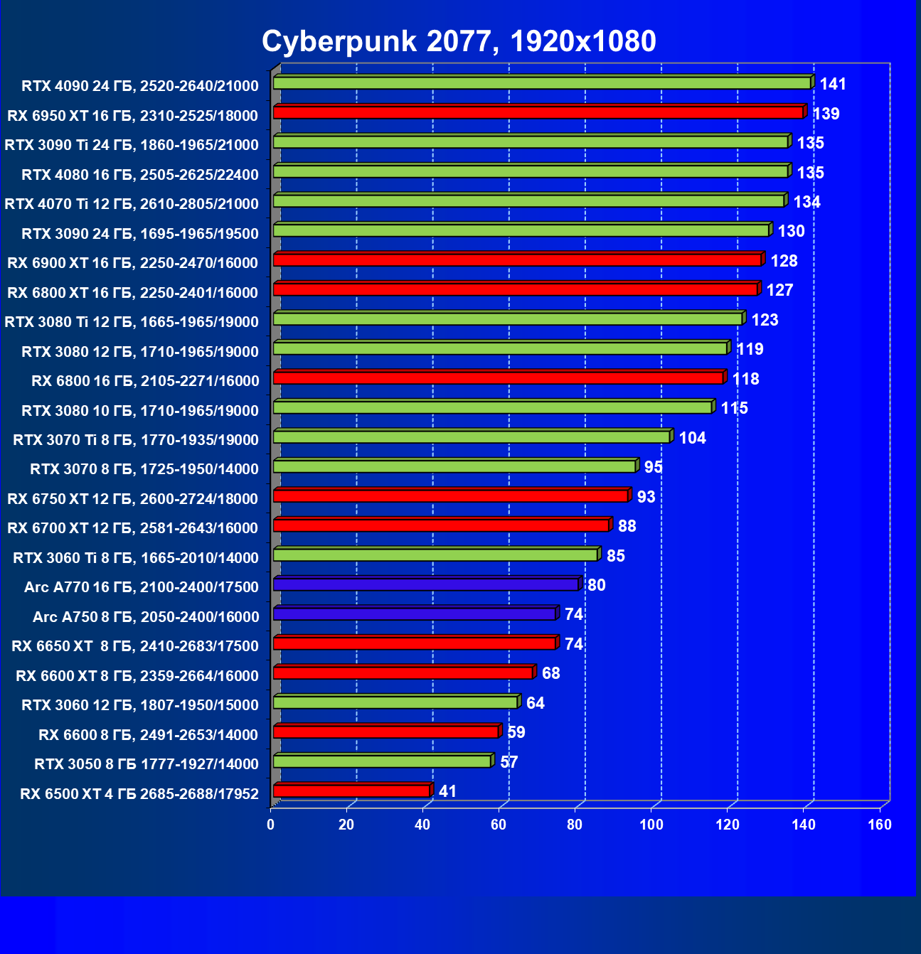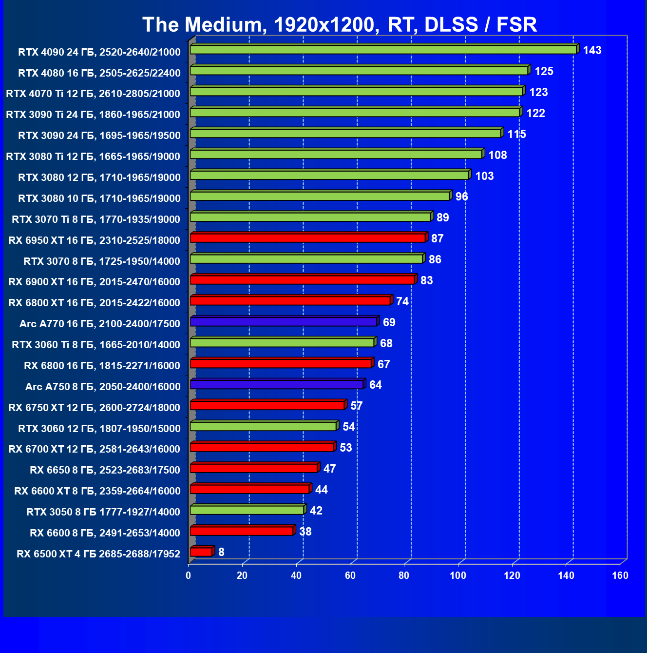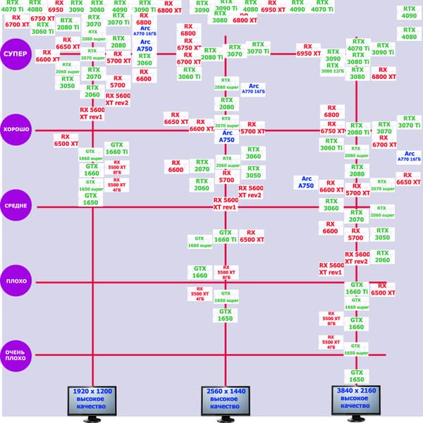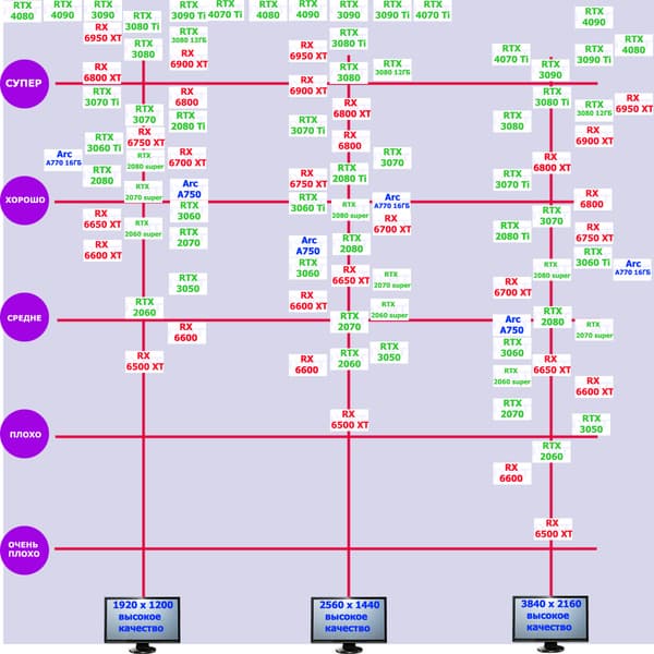 Перечисленные видеокарты логично справятся с более низким разрешением даже при включении трассировки лучей и уже не потребуют включения DLSS/FSR. Для игр без RT, но с максимальным качеством графики в современных играх хорошо подойдут также GeForce RTX 3070, GeForce RTX 3060 Ti, Radeon RX 6750 XT, Radeon RX 6700 XT и даже Radeon RX 6650 XT, а также новинка в лице Intel Arc A770.