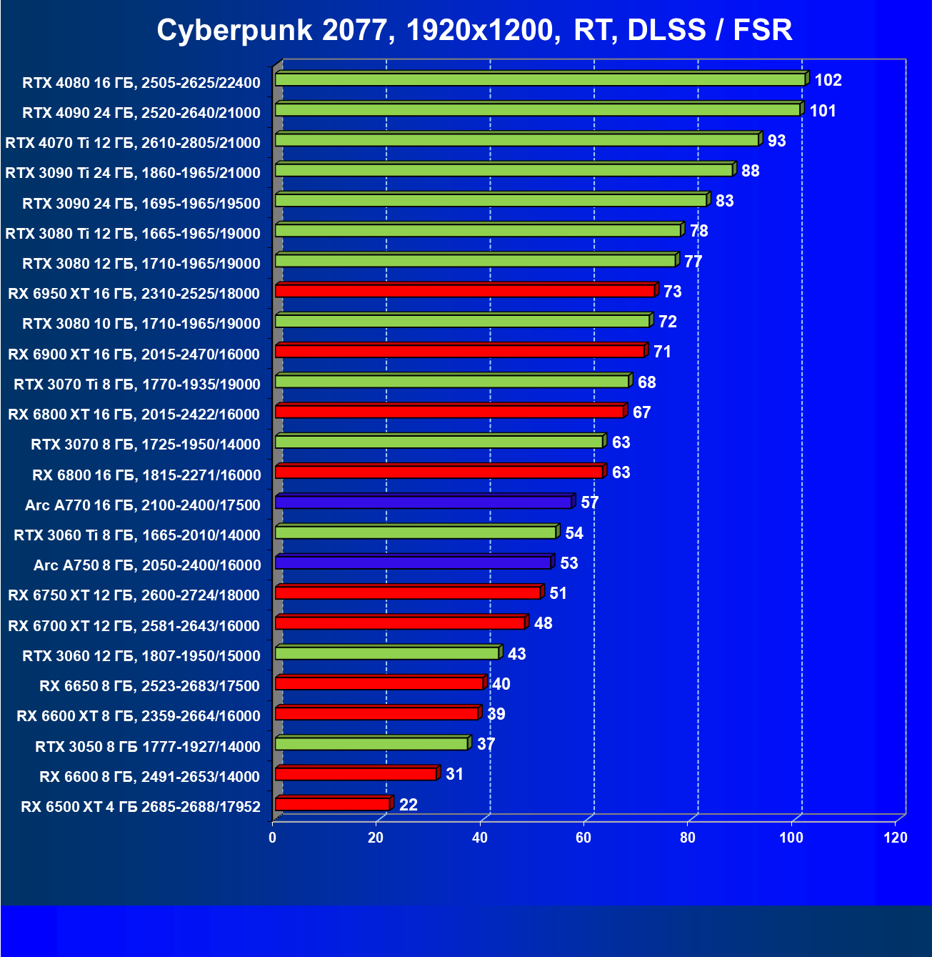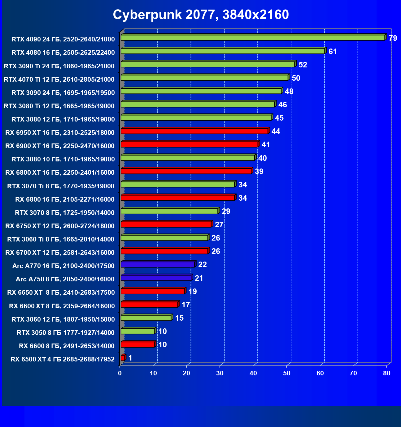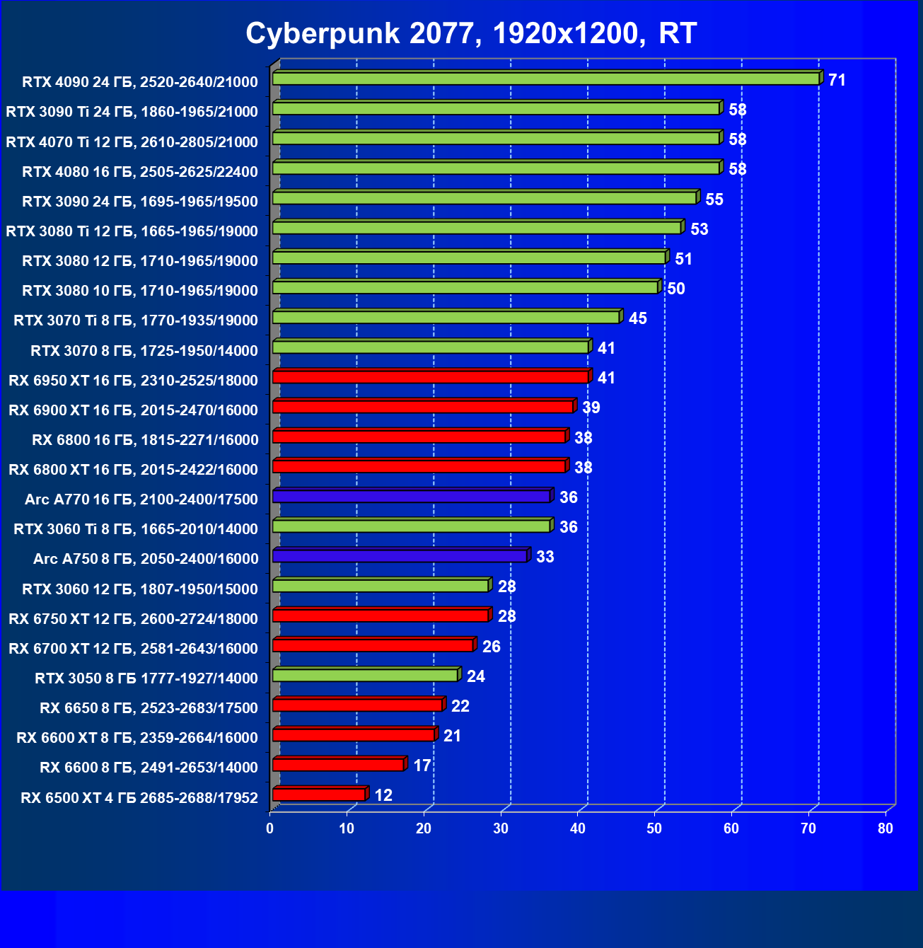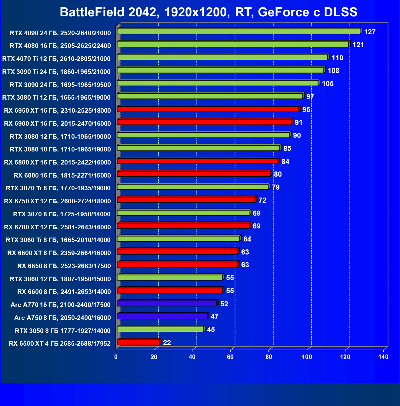 Перечисленные видеокарты логично справятся с более низким разрешением даже при включении трассировки лучей и уже не потребуют включения DLSS/FSR. Для игр без RT, но с максимальным качеством графики в современных играх хорошо подойдут также GeForce RTX 3070, GeForce RTX 3060 Ti, Radeon RX 6750 XT, Radeon RX 6700 XT и даже Radeon RX 6650 XT, а также новинка в лице Intel Arc A770.