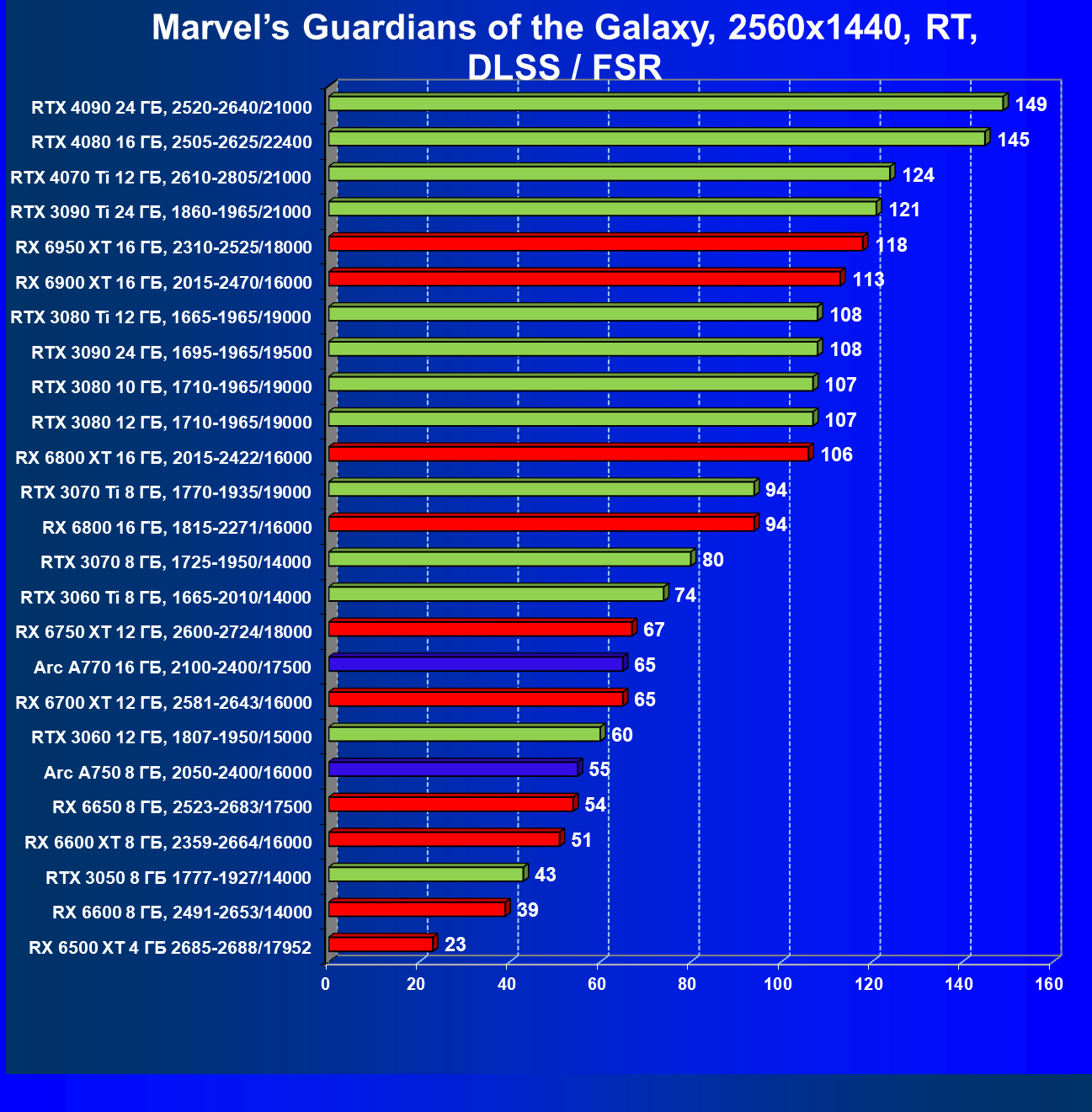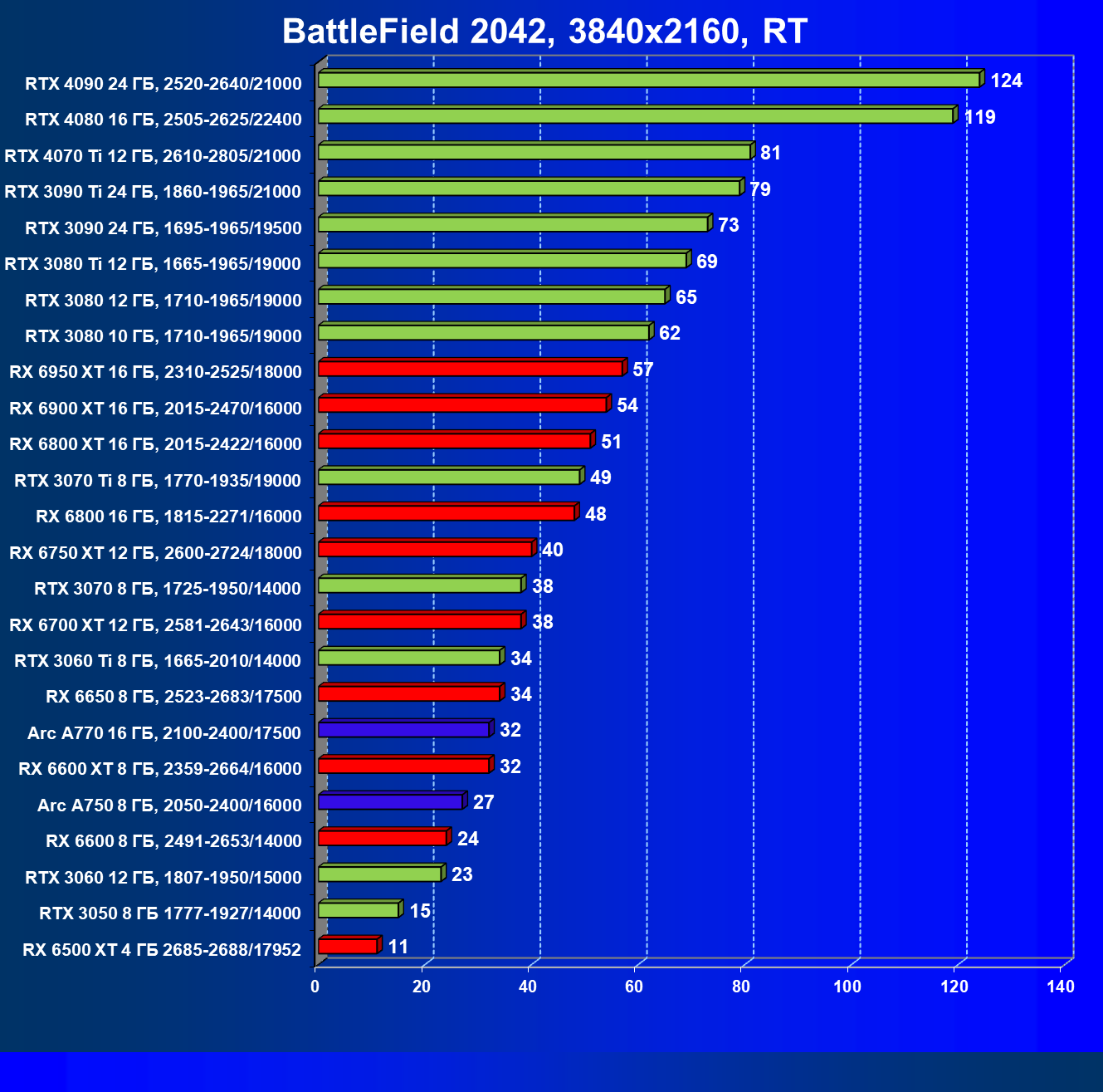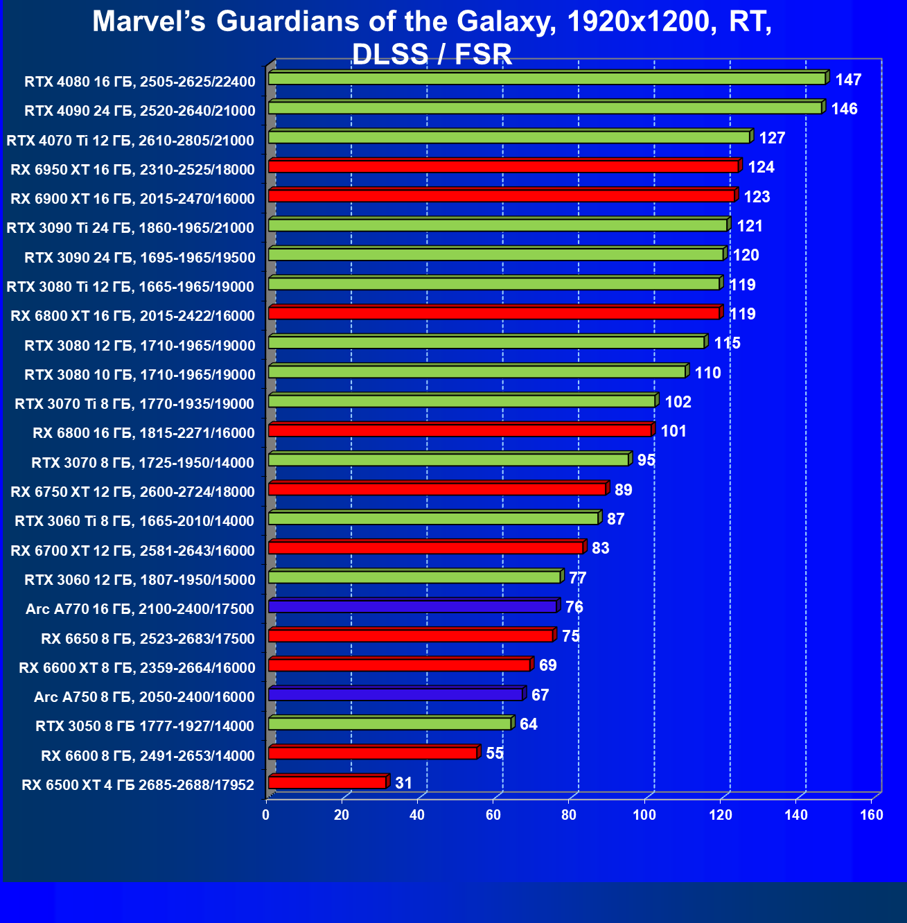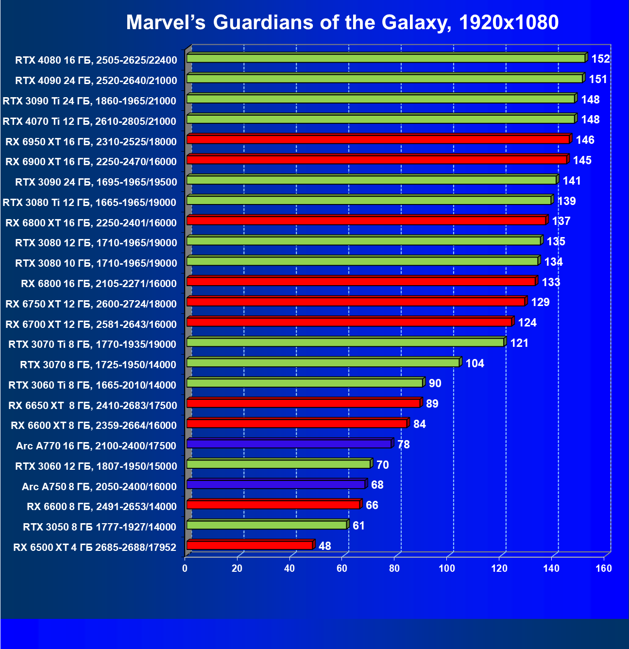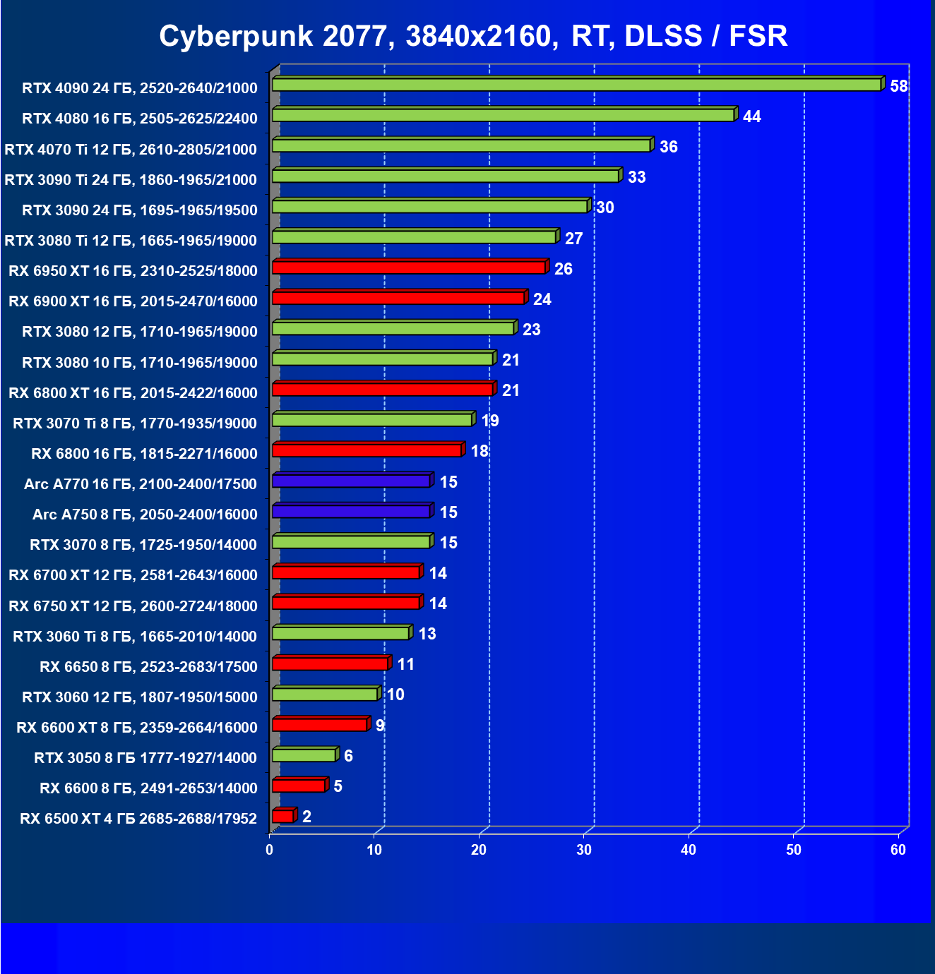 Перечисленные видеокарты логично справятся с более низким разрешением даже при включении трассировки лучей и уже не потребуют включения DLSS/FSR. Для игр без RT, но с максимальным качеством графики в современных играх хорошо подойдут также GeForce RTX 3070, GeForce RTX 3060 Ti, Radeon RX 6750 XT, Radeon RX 6700 XT и даже Radeon RX 6650 XT, а также новинка в лице Intel Arc A770.
