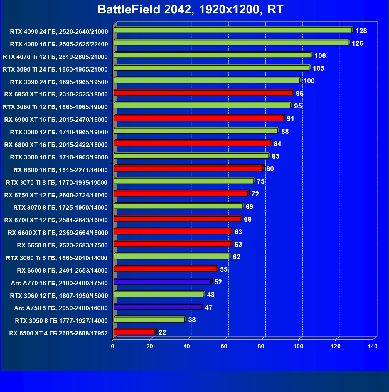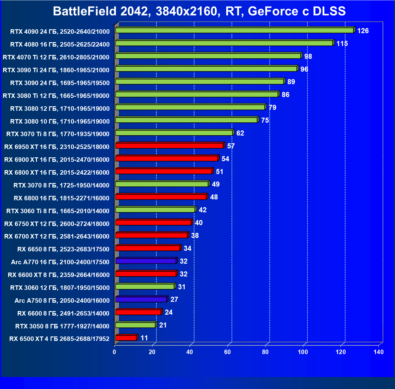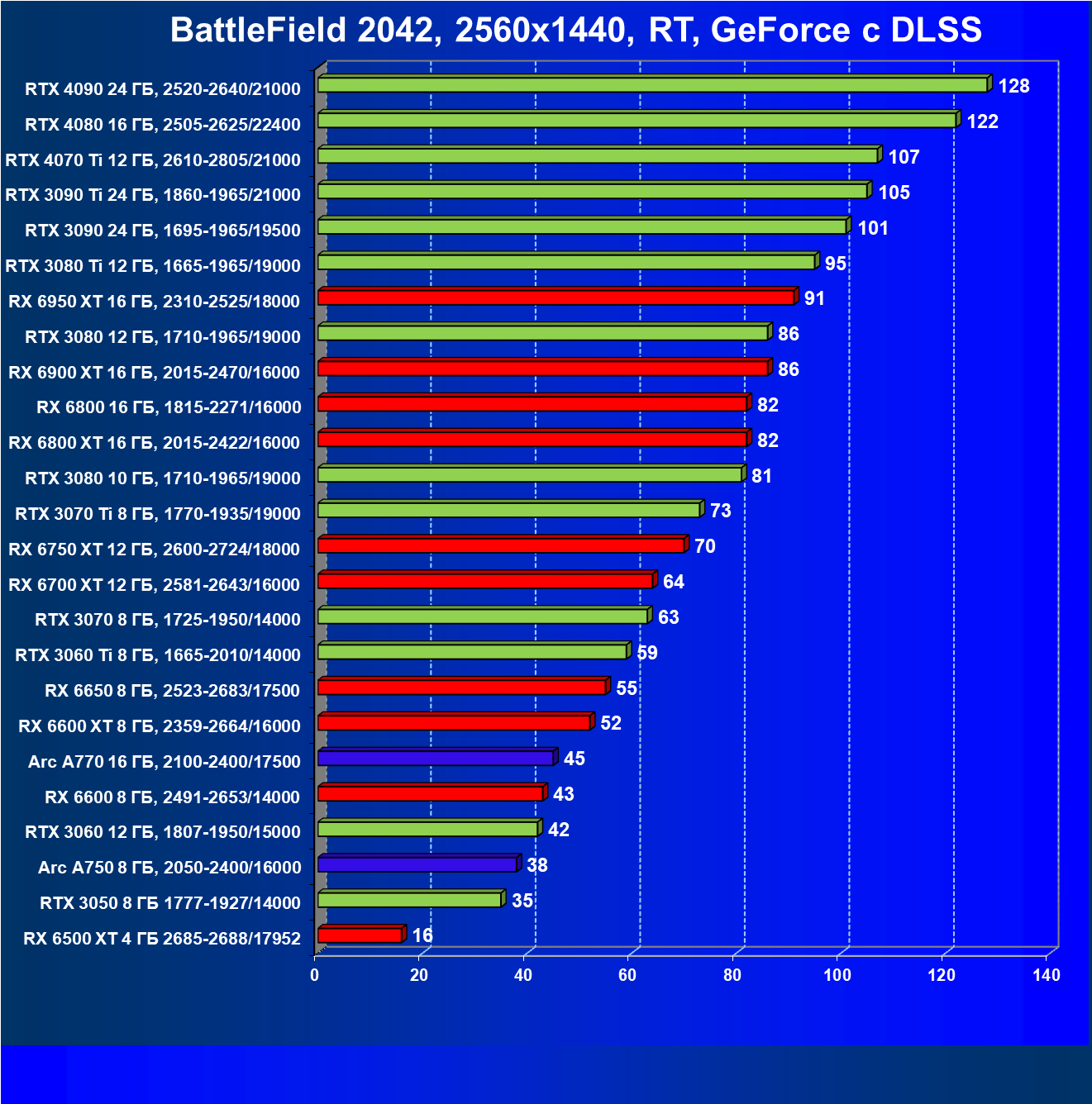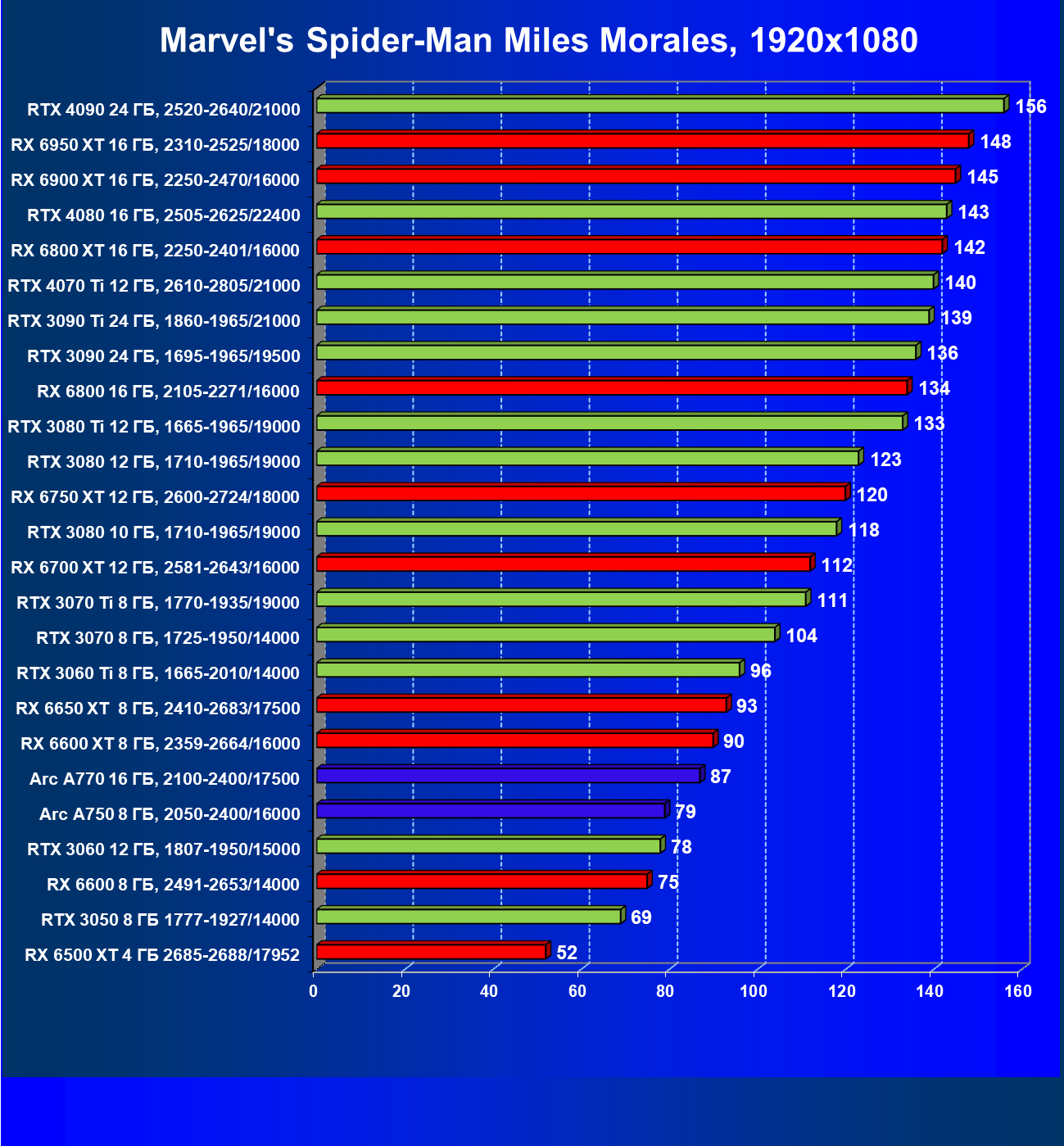 Перечисленные видеокарты логично справятся с более низким разрешением даже при включении трассировки лучей и уже не потребуют включения DLSS/FSR. Для игр без RT, но с максимальным качеством графики в современных играх хорошо подойдут также GeForce RTX 3070, GeForce RTX 3060 Ti, Radeon RX 6750 XT, Radeon RX 6700 XT и даже Radeon RX 6650 XT, а также новинка в лице Intel Arc A770.