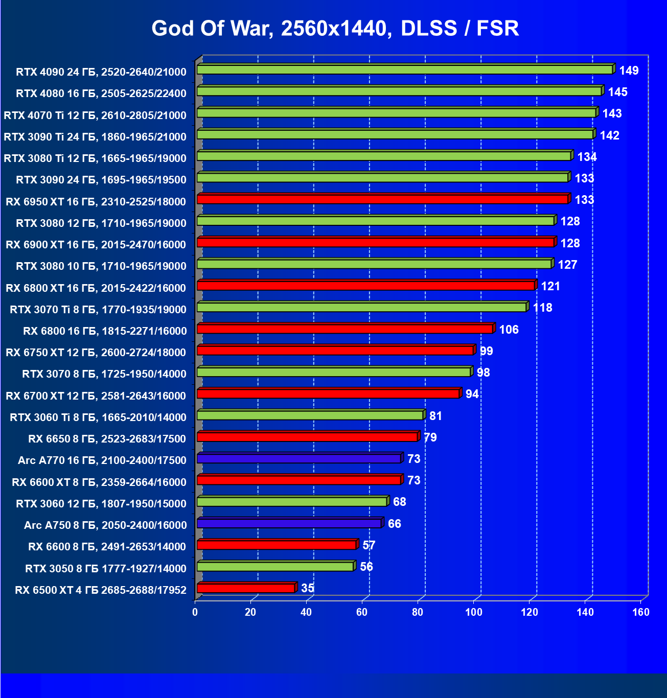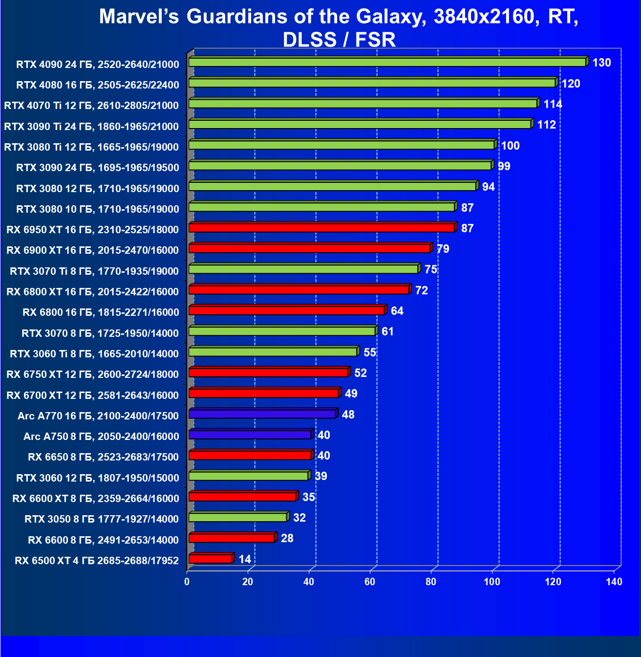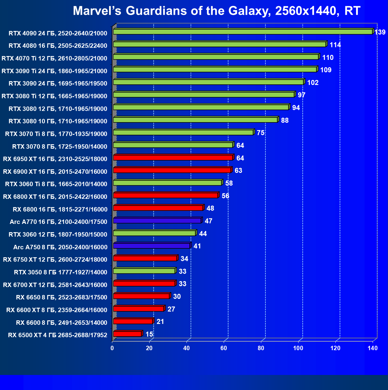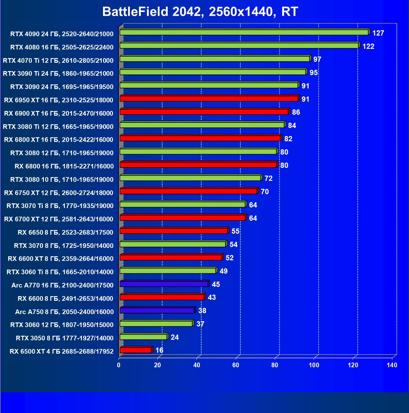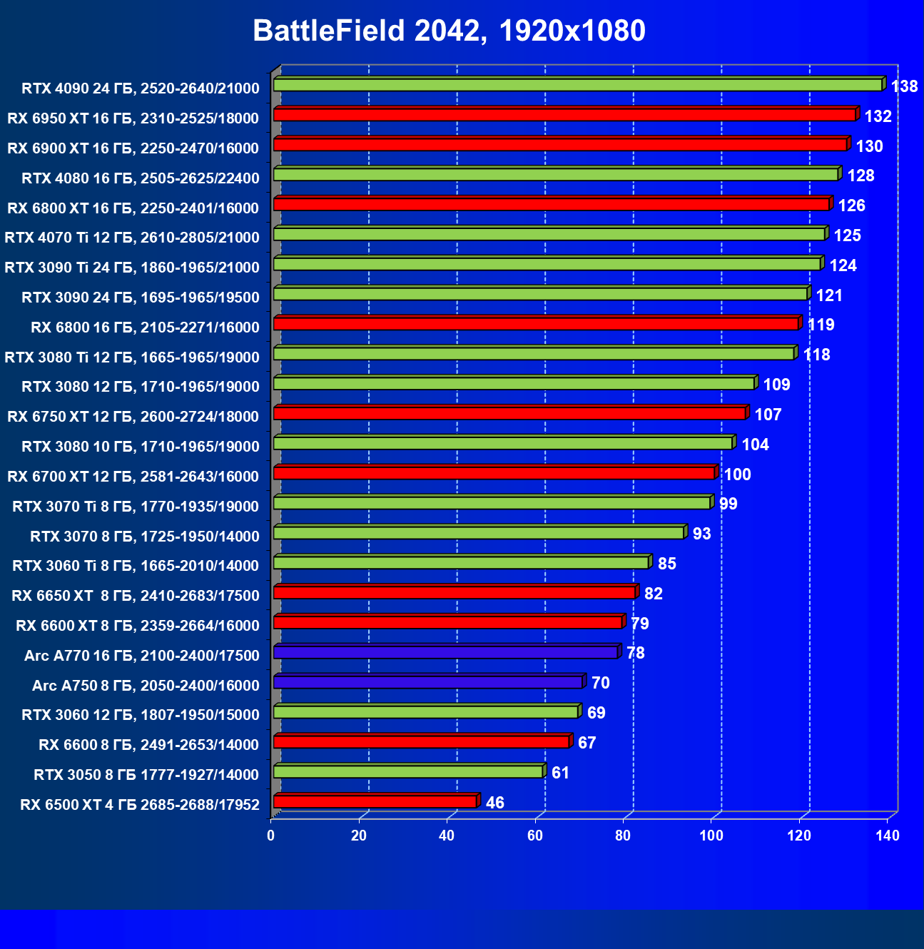 Перечисленные видеокарты логично справятся с более низким разрешением даже при включении трассировки лучей и уже не потребуют включения DLSS/FSR. Для игр без RT, но с максимальным качеством графики в современных играх хорошо подойдут также GeForce RTX 3070, GeForce RTX 3060 Ti, Radeon RX 6750 XT, Radeon RX 6700 XT и даже Radeon RX 6650 XT, а также новинка в лице Intel Arc A770.