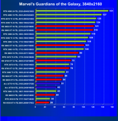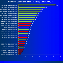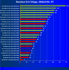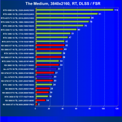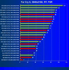 Ускорители семейства Radeon RX 6000 при включении RT в разрешении 4K смотрятся гораздо бледнее, обычно в их случае можно рассчитывать лишь на комфорт в разрешении 2.5K (да и то с включением FSR). Даже Radeon RX 6950 XT с трудом справляется с играми в разрешении 4K с трассировкой лучей, его и RX 6900 XT спасает только поддержка в игре технологии FSR. В этом плане у семейства GeForce RTX ситуация лучше.
