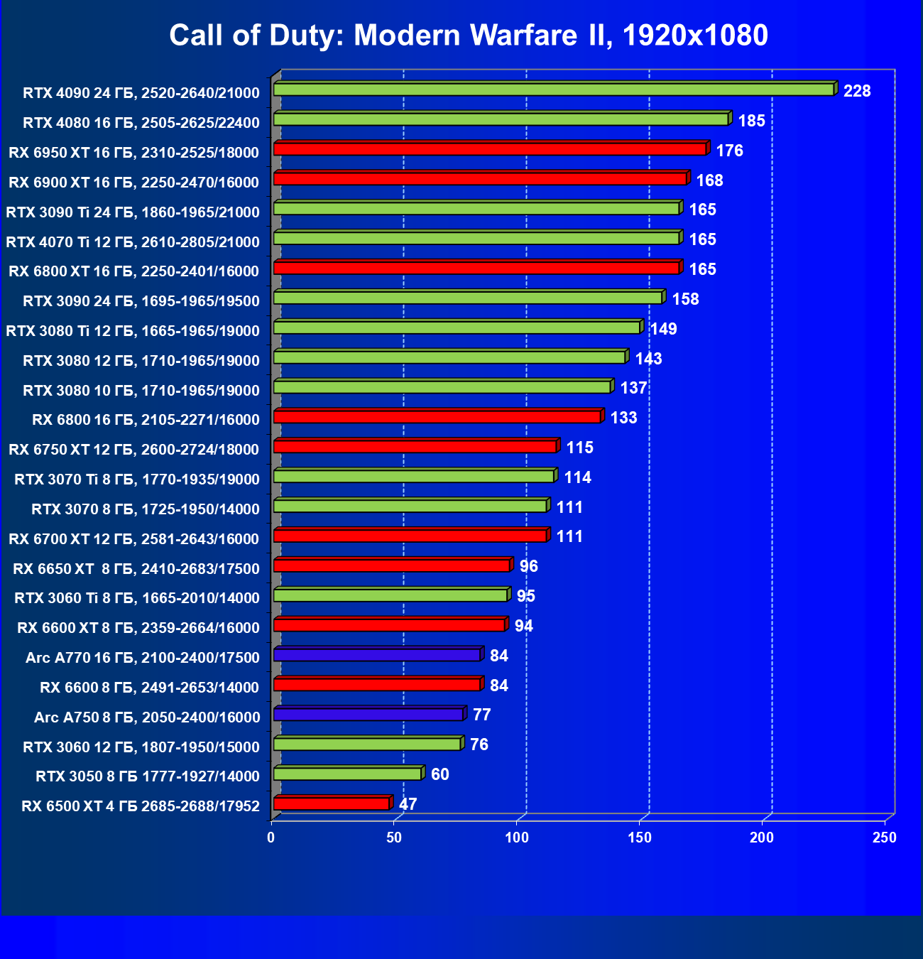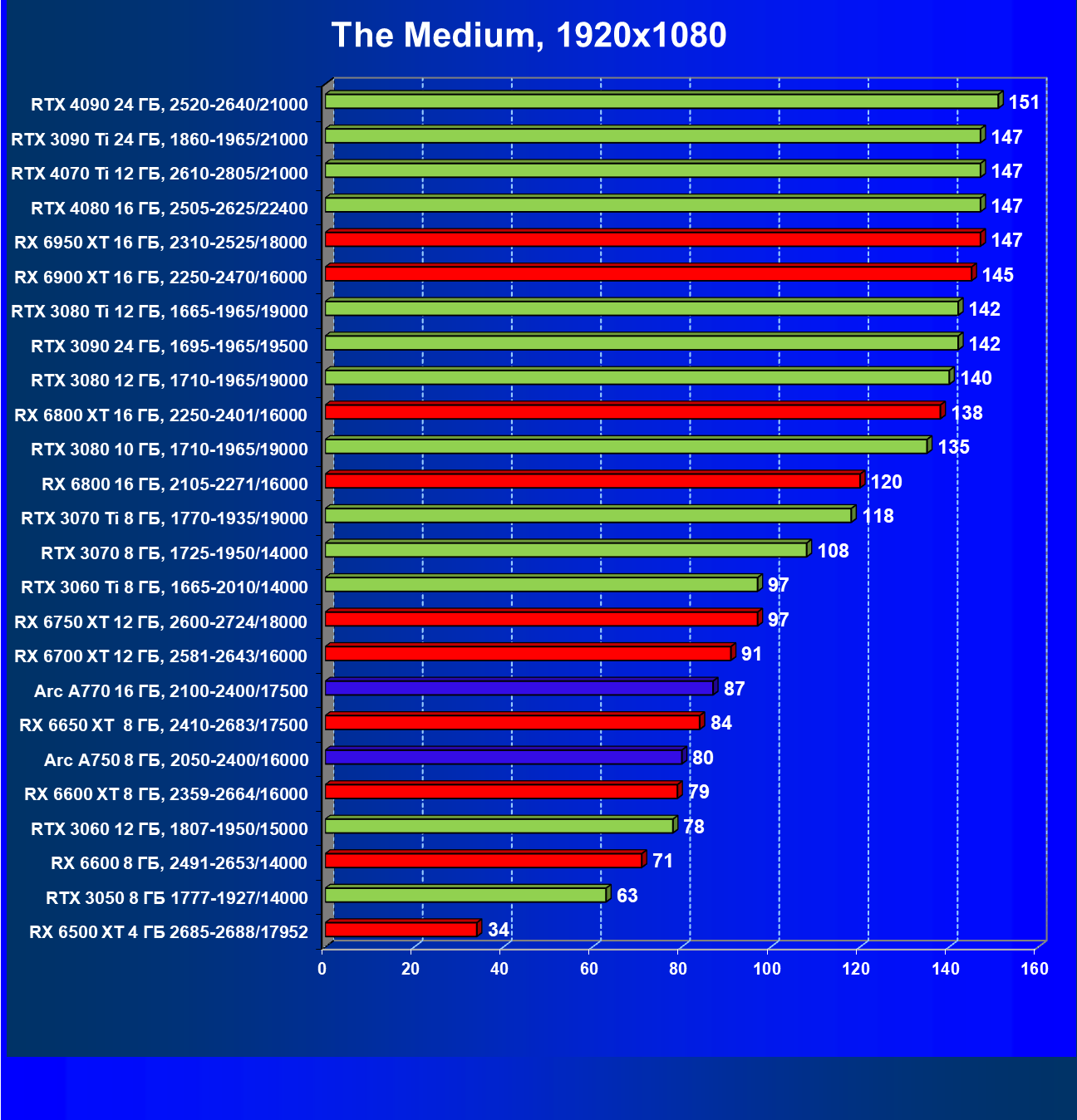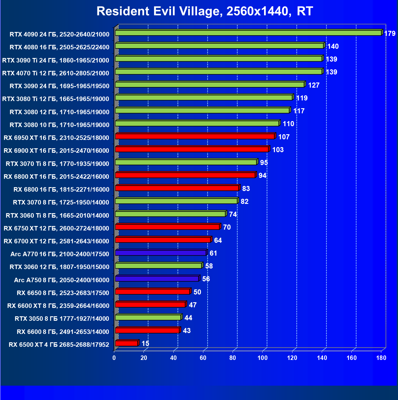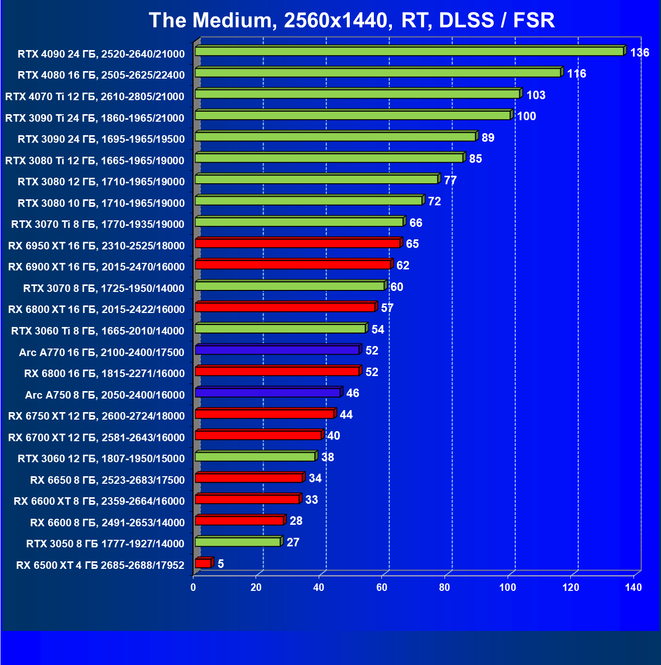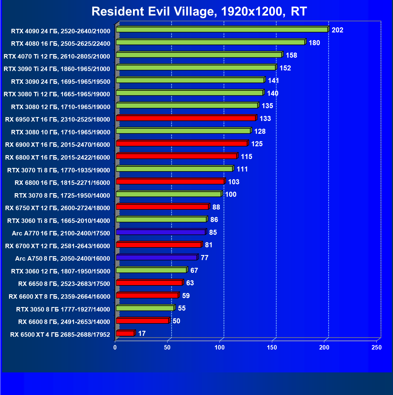 Все упомянутые видеокарты подойдут и для игр на мониторах с более массовым разрешением Full HD. При включении трассировки лучей совместно с DLSS, FSR или XeSS полный комфорт обеспечивают карты уровня Radeon RX 6600 XT и GeForce RTX 3060, GeForce RTX 3050, а также Intel Arc A770. А вот Radeon RX 6500 XT включение RT просто не потянет.