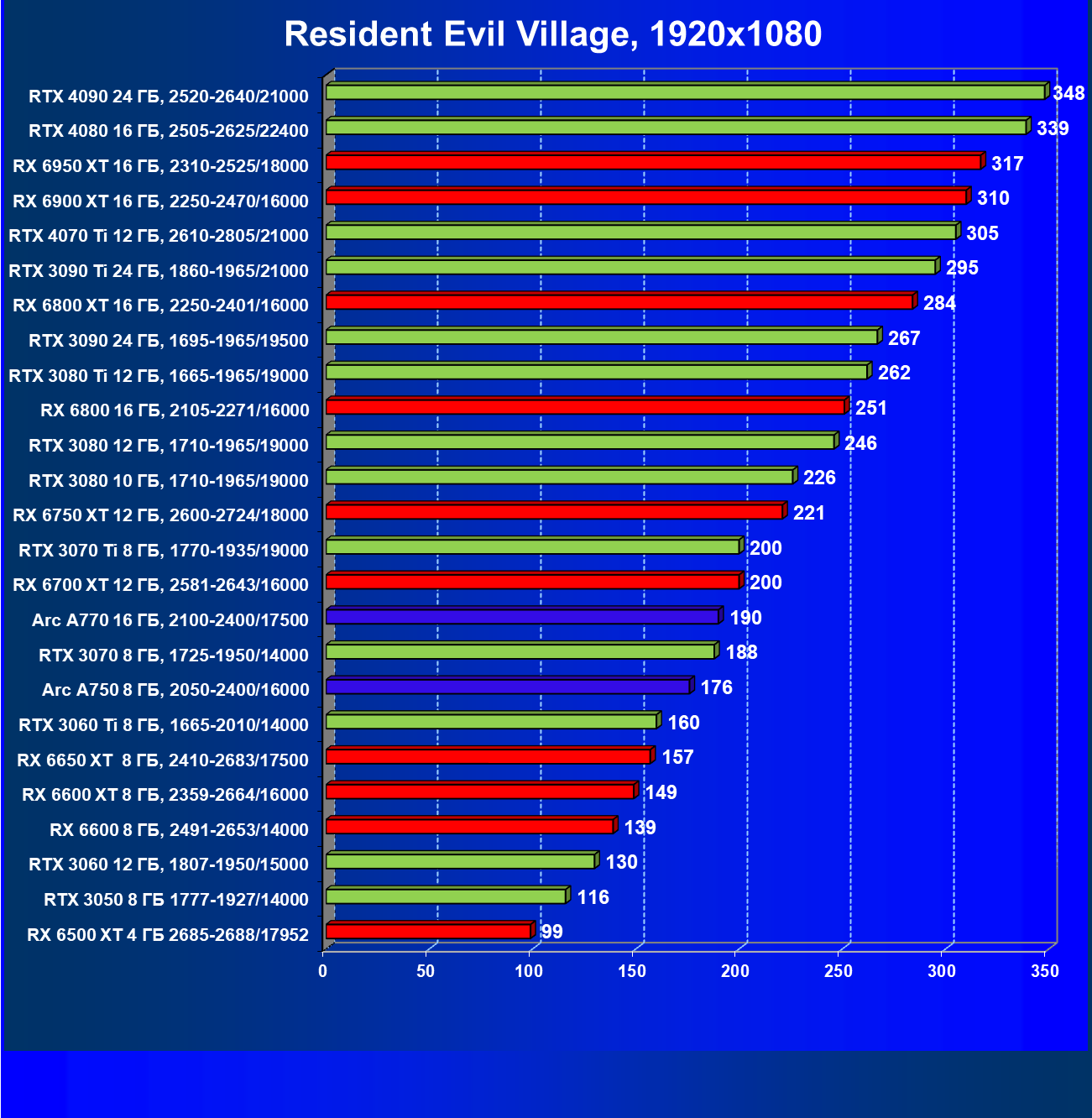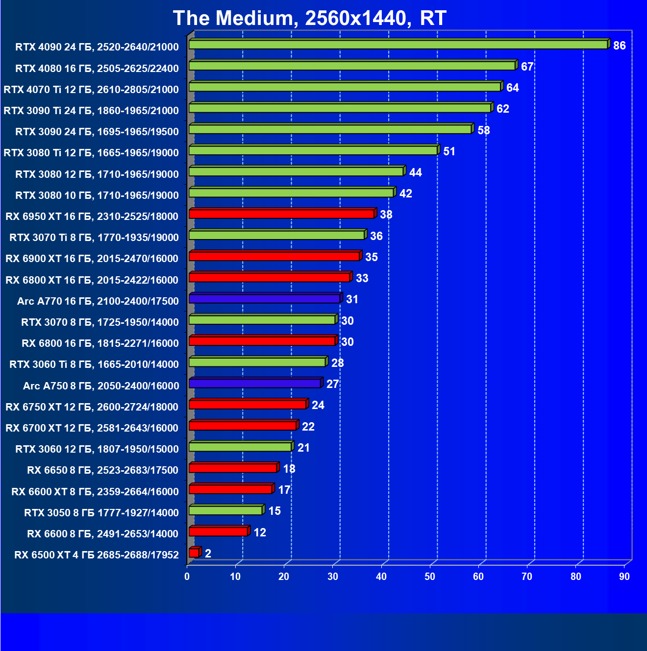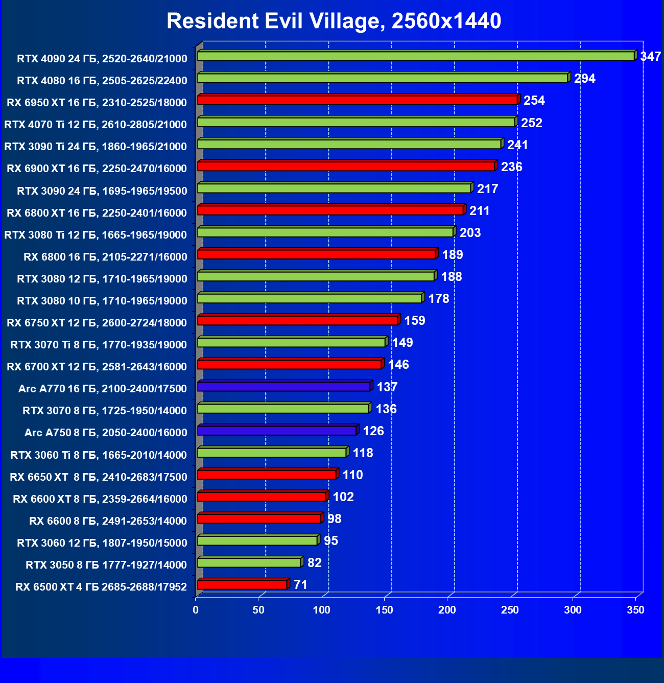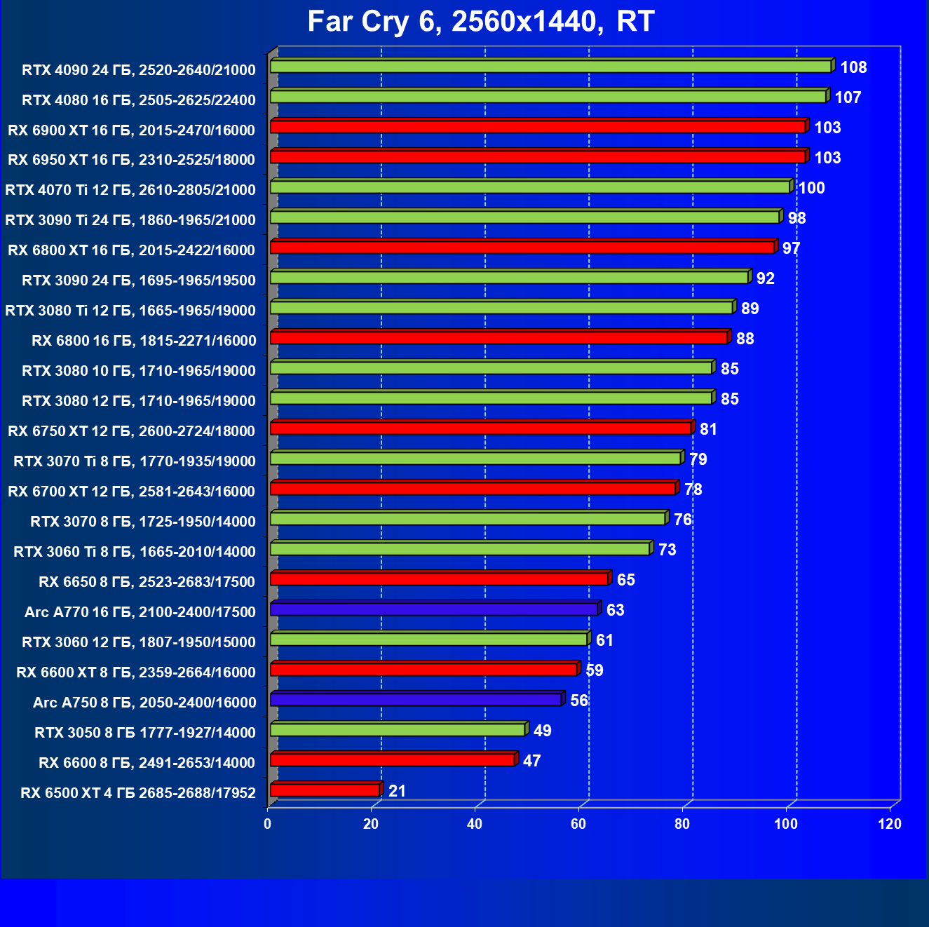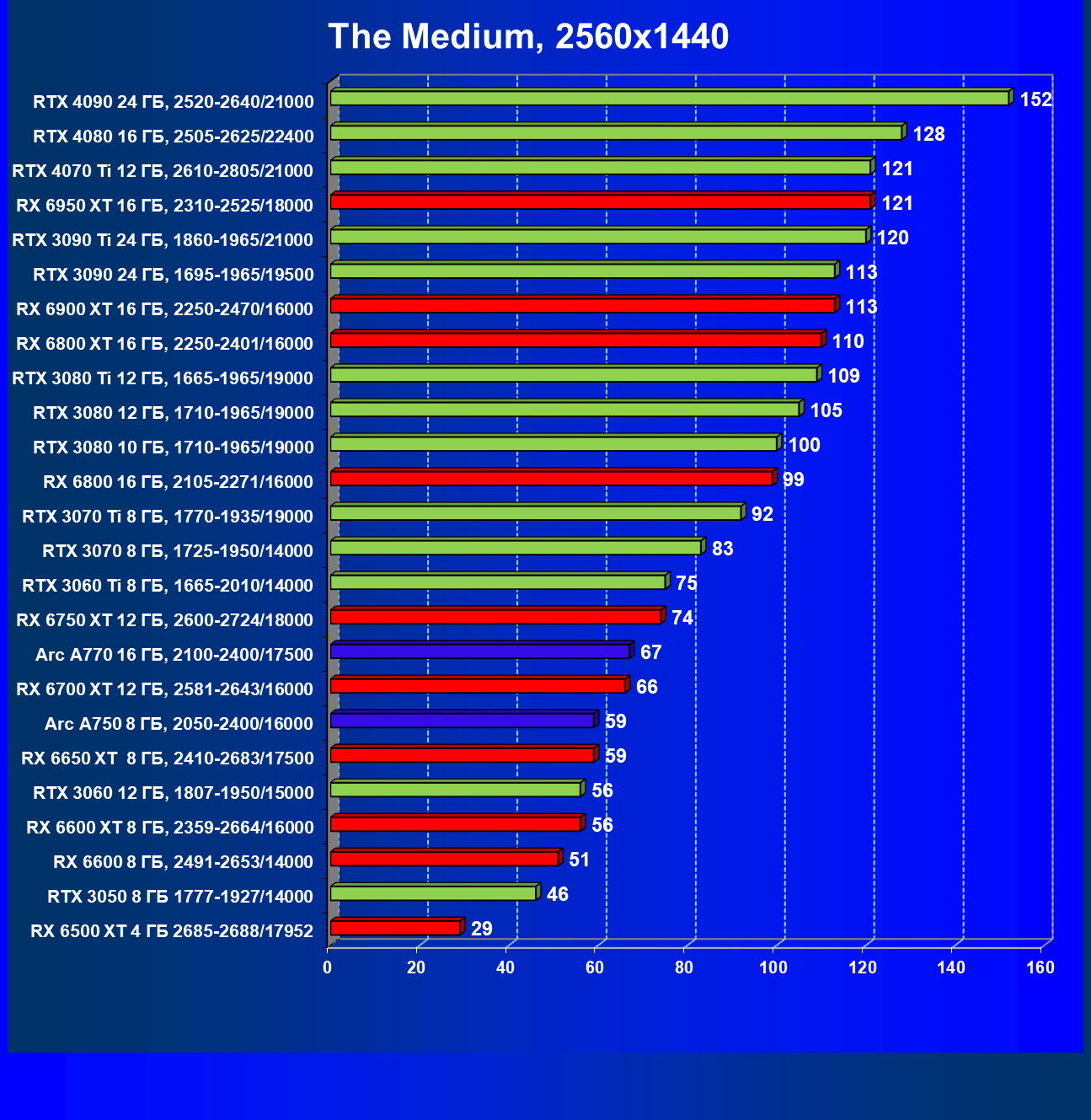 Все упомянутые видеокарты подойдут и для игр на мониторах с более массовым разрешением Full HD. При включении трассировки лучей совместно с DLSS, FSR или XeSS полный комфорт обеспечивают карты уровня Radeon RX 6600 XT и GeForce RTX 3060, GeForce RTX 3050, а также Intel Arc A770. А вот Radeon RX 6500 XT включение RT просто не потянет.