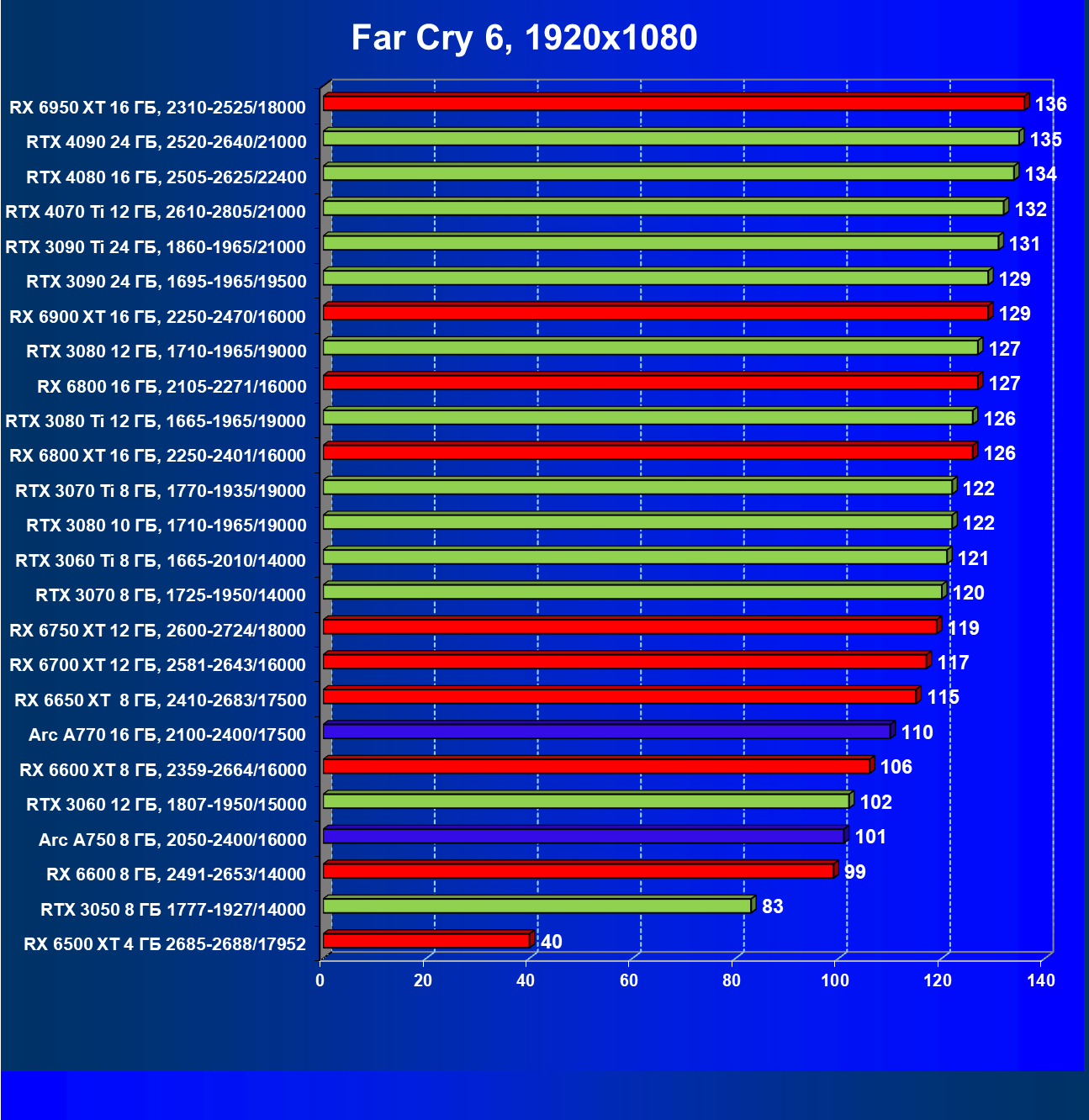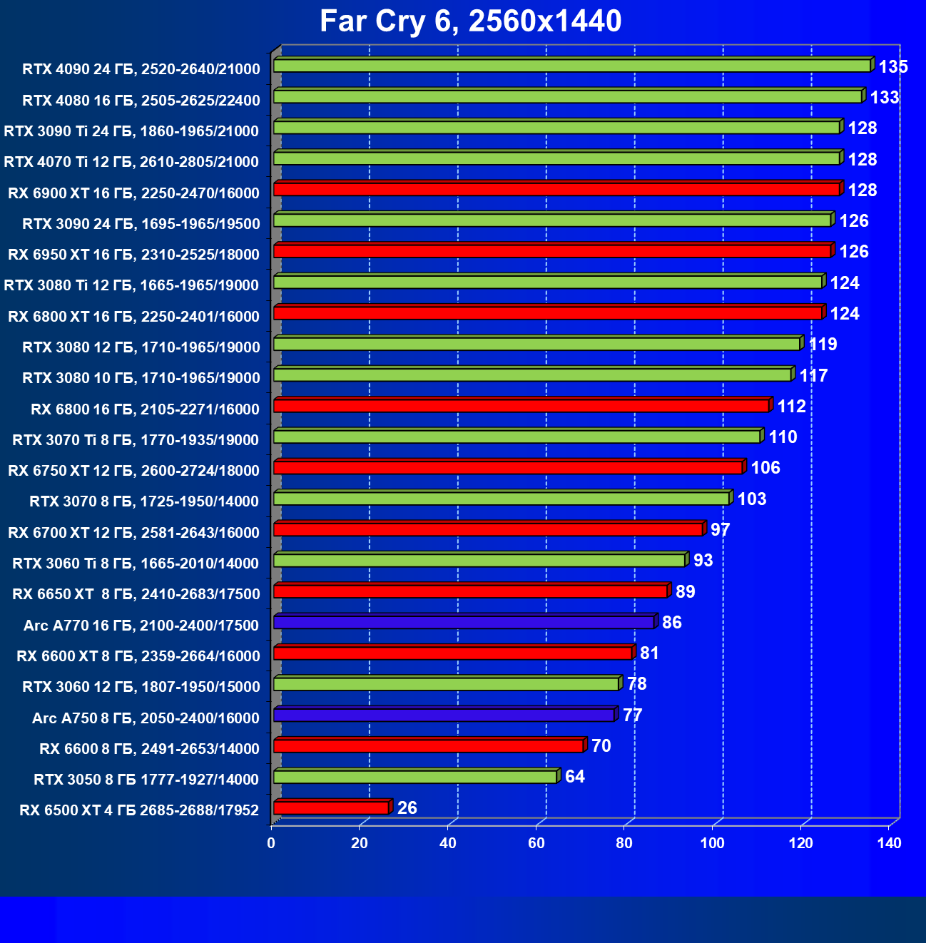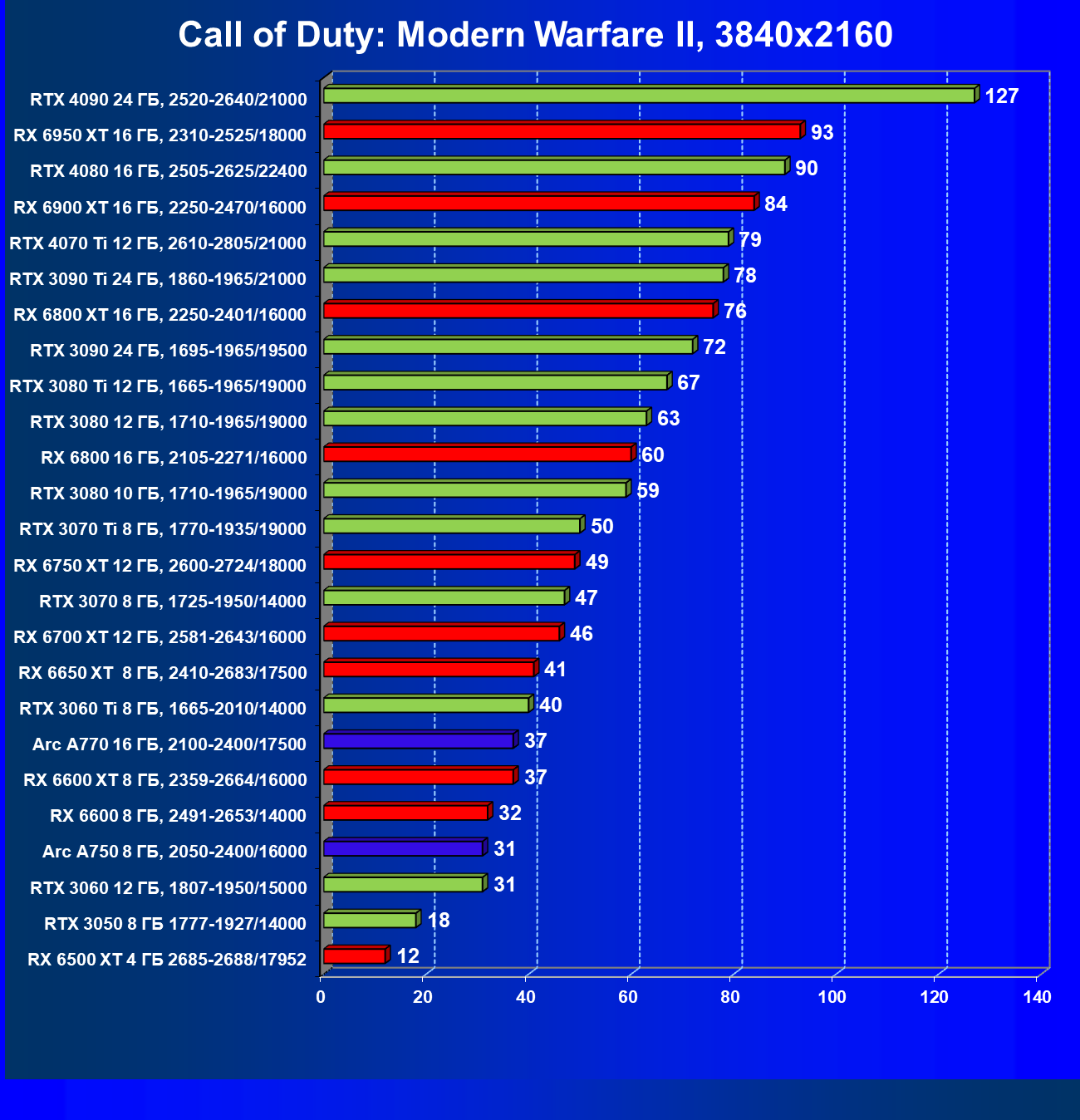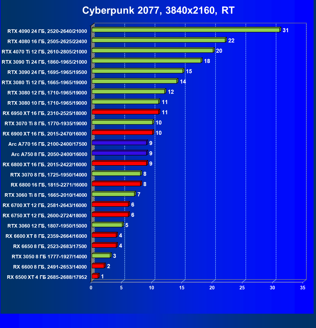Тем не менее, в принципе, в ценовой категории до 30 000 рублей можно было бы назвать лучшим вариантом и Radeon RX 6600. Еще одним перспективным вариантом в этом ценовом диапазоне является карта Intel Arc A750 — она даже производительнее, чем GeForce RTX 3060. Однако нормальных розничных продаж этой карты Intel в России на момент подготовки статьи не было.