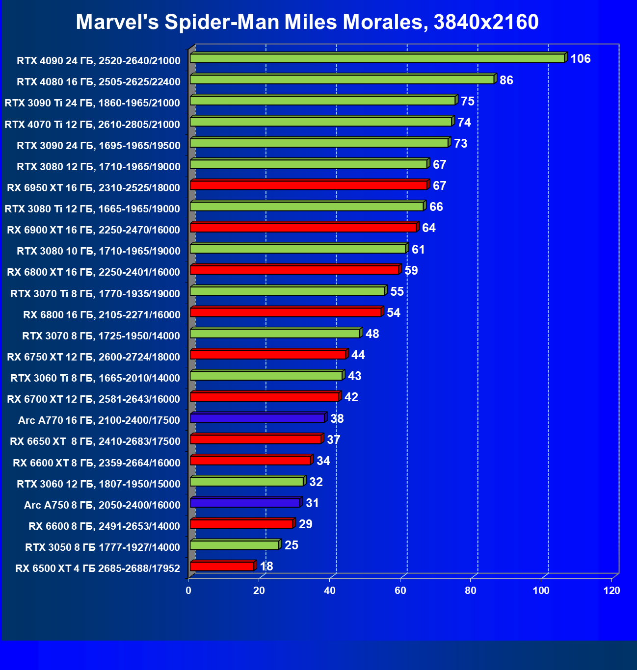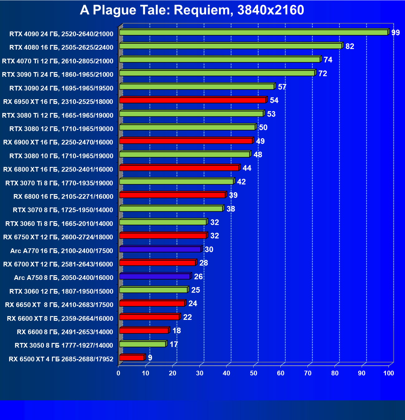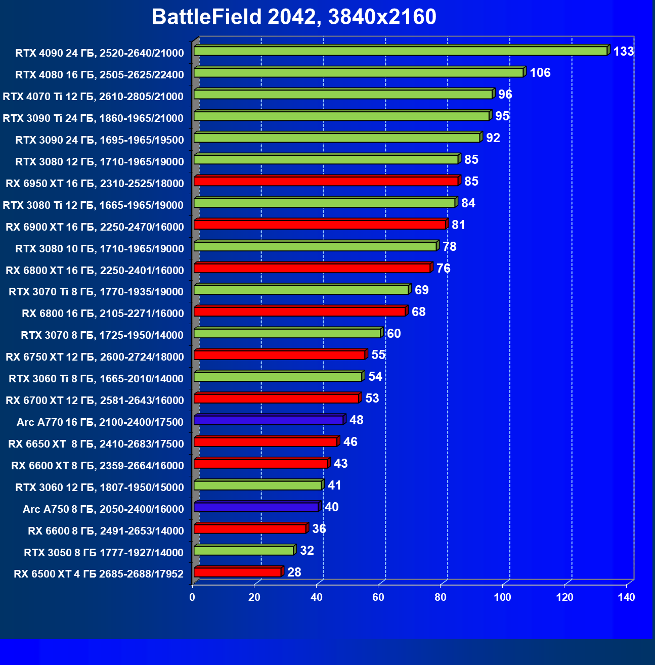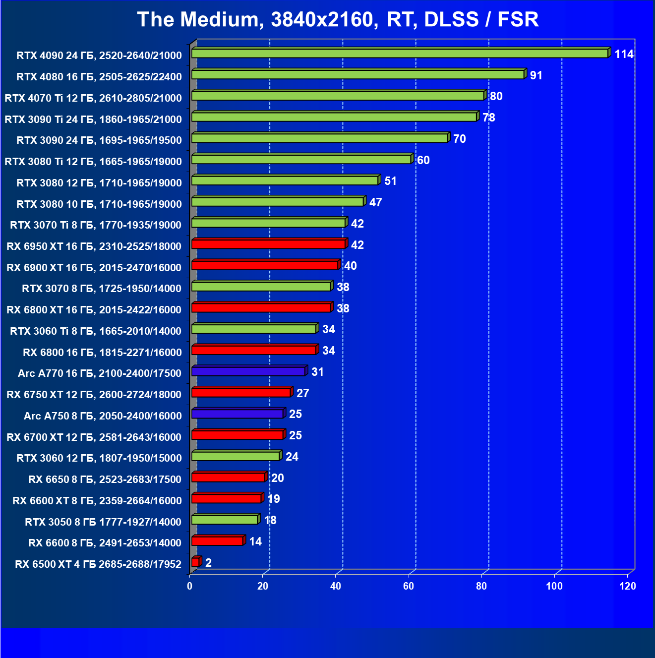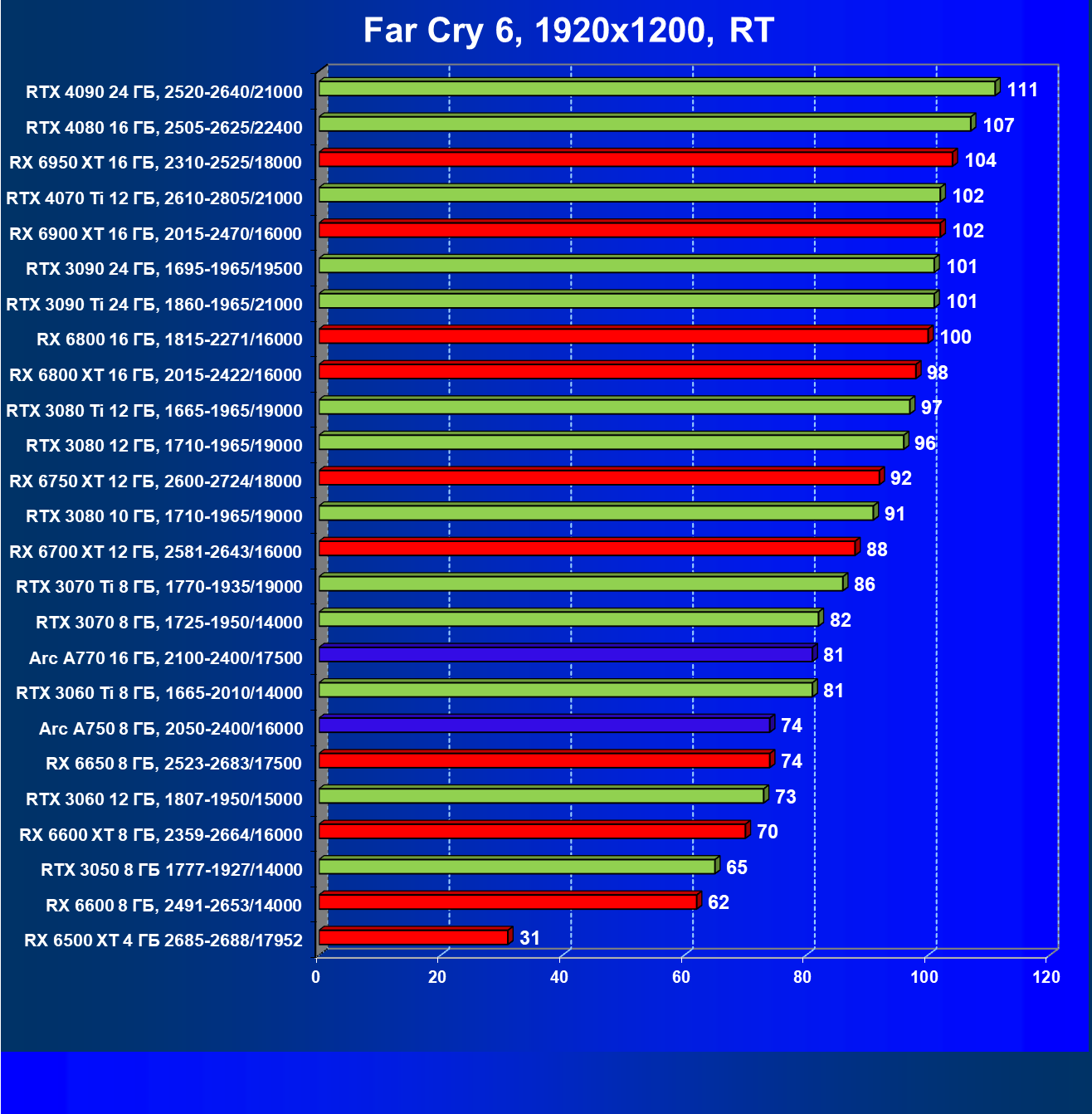 Тем не менее, в принципе, в ценовой категории до 30 000 рублей можно было бы назвать лучшим вариантом и Radeon RX 6600. Еще одним перспективным вариантом в этом ценовом диапазоне является карта Intel Arc A750 — она даже производительнее, чем GeForce RTX 3060. Однако нормальных розничных продаж этой карты Intel в России на момент подготовки статьи не было.