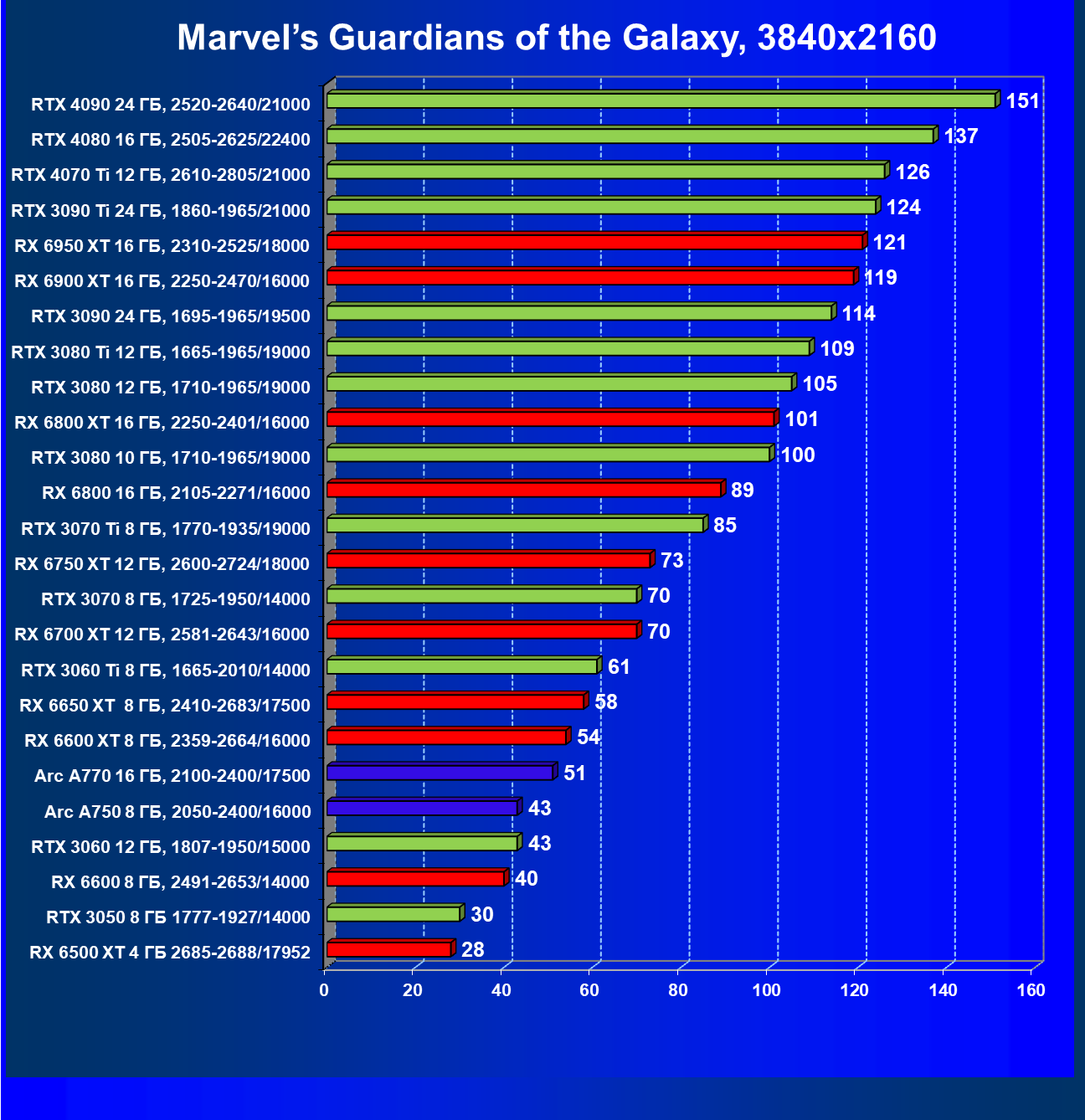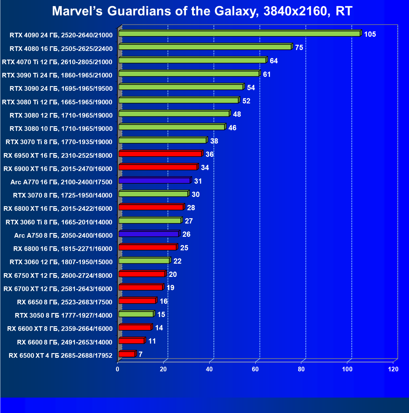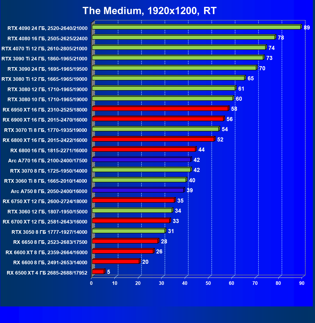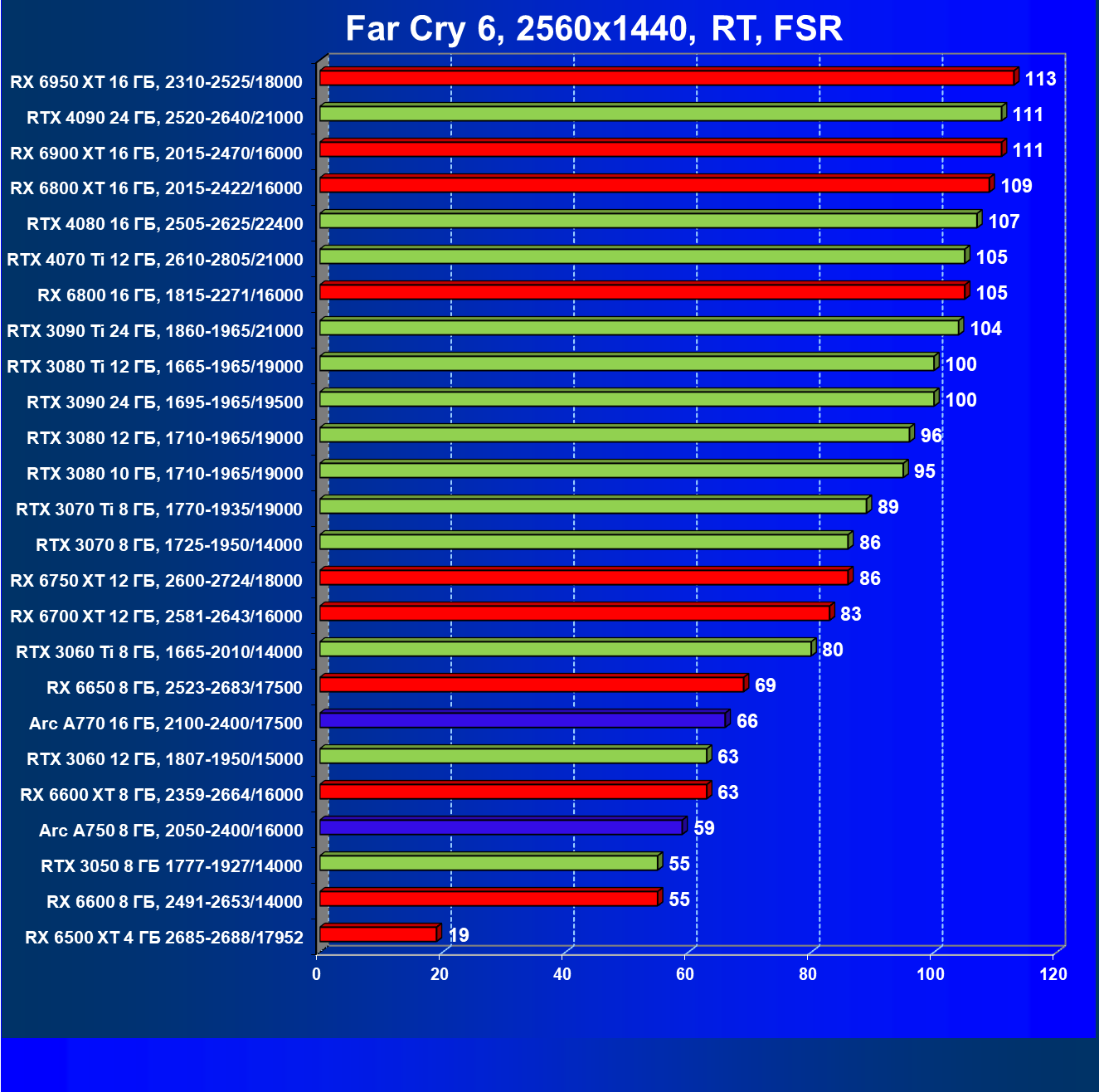 Тем не менее, в принципе, в ценовой категории до 30 000 рублей можно было бы назвать лучшим вариантом и Radeon RX 6600. Еще одним перспективным вариантом в этом ценовом диапазоне является карта Intel Arc A750 — она даже производительнее, чем GeForce RTX 3060. Однако нормальных розничных продаж этой карты Intel в России на момент подготовки статьи не было.