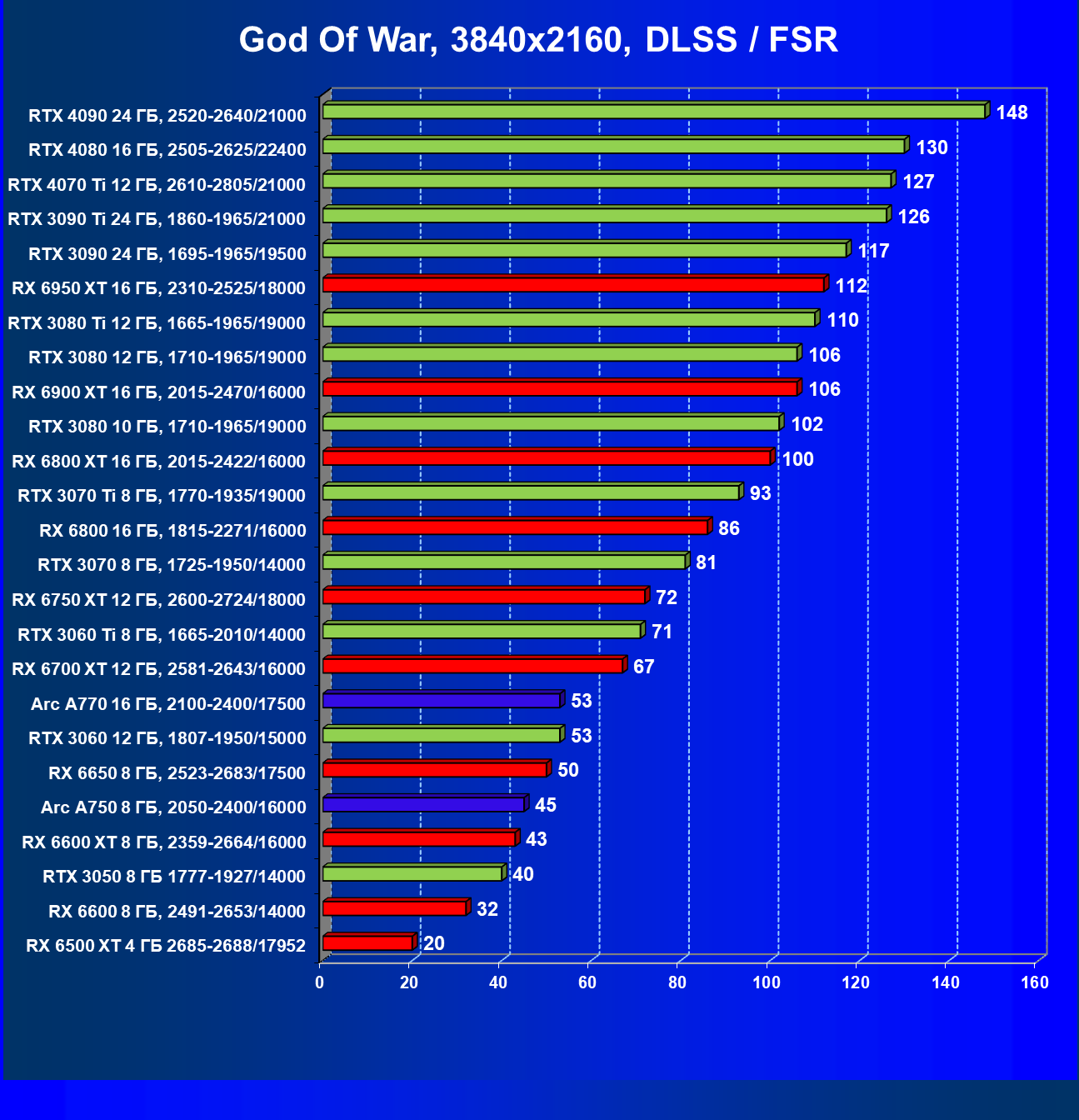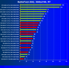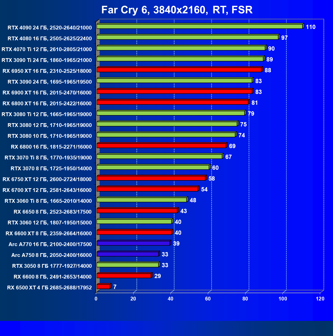 Лучшие ускорители для игры в разрешении 4K при максимальных настройках графики, но без трассировки лучей — GeForce RTX 3090 Ti, GeForce RTX 3090, GeForce RTX 3080 Ti и GeForce RTX 3080, а также Radeon RX 6950 XT, Radeon RX 6900 XT и Radeon RX 6800 XT. Последние новинки GeForce RTX 4080 и GeForce RTX 4090 осиливают даже разрешение 8K, и к ним присоединяется GeForce RTX 4070 Ti. Менее производительные карты уровня GeForce RTX 3070 Ti, GeForce RTX 3070 и Radeon RX 6800 демонстрируют в разрешении 4K приемлемый FPS не во всех играх даже без включения RT (но при максимальных настройках графики), и желательно будет включать DLSS/FSR.