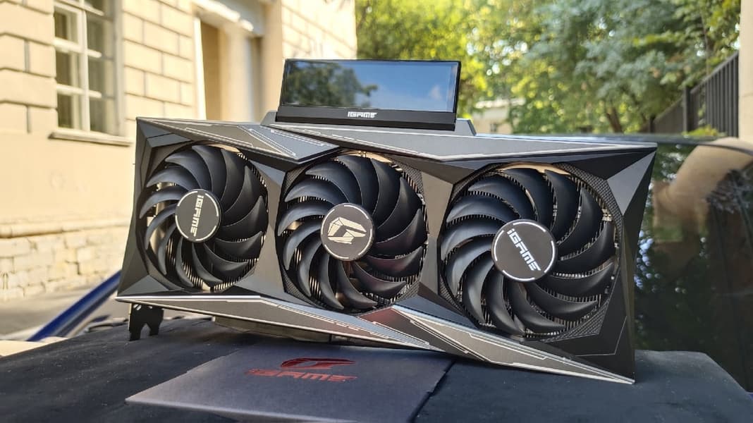 Выбранная карта Palit имеет, разумеется, огромные, даже несколько пугающие габариты: 330×138×72 мм (7 сантиметров толщины и занимает 4 слота в системном блоке!). Поверх радиатора установлены три вентилятора ∅90 мм. Зато с таким огромным кулером карта работает достаточно тихо (менее 30 дБА), а нагрев даже при ручном разгоне не превышал 71 градуса у GPU и 79 градусов у памяти. При этом разгон обеспечивает прирост в играх в разрешении 4K почти на 8% относительно референсных значений. Правда, энергопотребление карты при этом достигает 527 Вт, что выдержит не каждый блок питания. Набор видеовыходов стандартный — 1×HDMI 2.1 и 3×DisplayPort 1.4a. У карты имеется красивая подсветка Midnight Kaleidoscope.