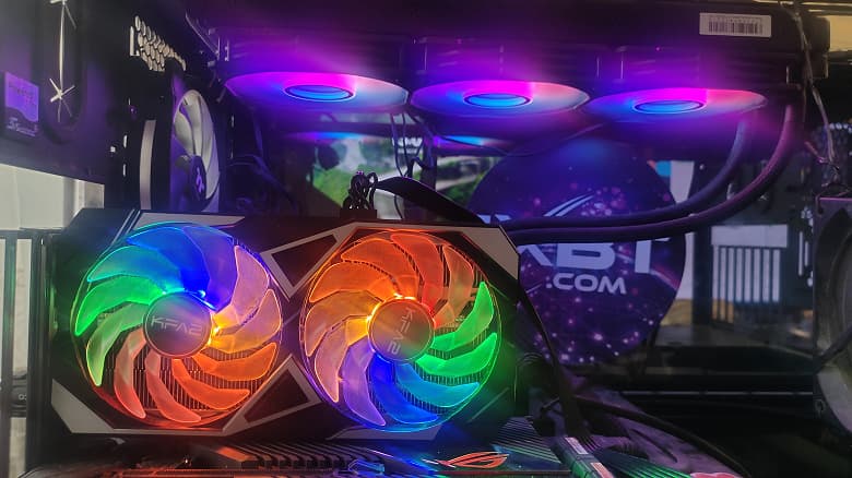 Система охлаждения у карты Palit GeForce RTX 3080 GamingPro довольно эффективная, но громкая. Видеокарта занимает три слота в системном блоке. Есть подсветка с настройкой режимов в фирменной утилите, хотя и довольно скудной.