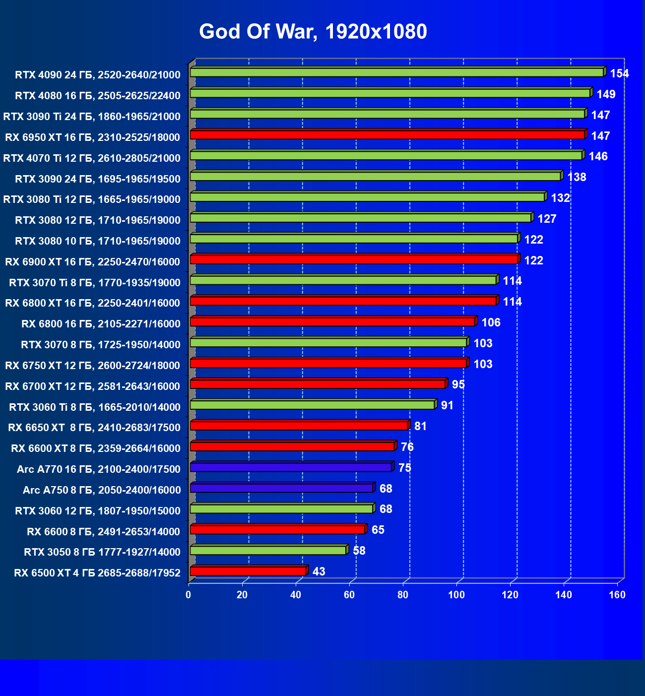 В разрешении Full HD можно ограничиться моделями GeForce RTX 3060, GeForce RTX 3050 (в его случае иногда придется снижать настройки графики) и Radeon RX 6600. Radeon RX 6500 XT при максимальных настройках графики обеспечит достаточный комфорт не во всех играх, включение FSR лишним не будет. Для данного разрешения также неплохо подходит Intel Arc A750. Без сомнений, комфортную производительность в классических играх обеспечат и карты прошлых поколений — GeForce RTX 2060, GeForce RTX 2060 Super и Radeon RX 5600 XT. Приемлемо будут справляться Radeon RX 5500 XT с GeForce GTX 1660 Ti, которые потянут некоторые игры в Full HD на максимальных настройках. Менее производительные карты уже не тянут разрешение Full HD при максимальном качестве, а значит, придется снижать качество картинки или разрешение.