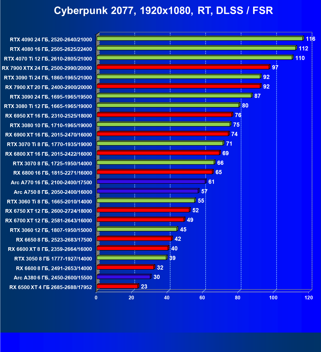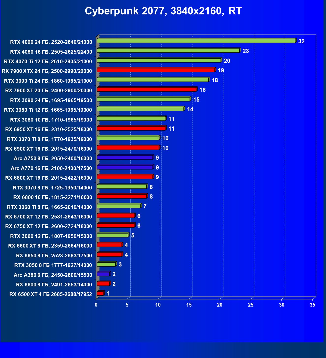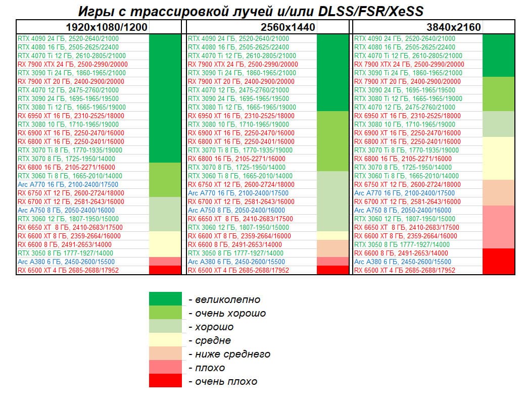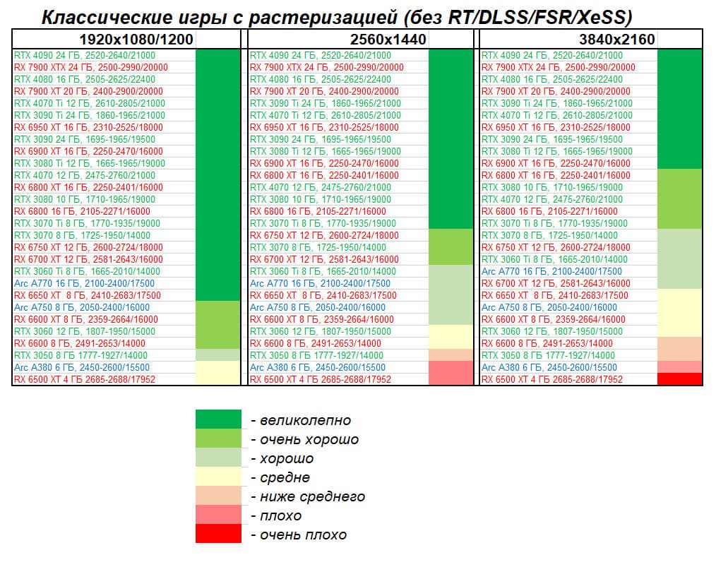 Этот материал демонстрирует не только общий рейтинг видеокарт по производительности, но и их полезность с учетом цены на начало апреля 2023 года (материал готовился до выхода на рынок GeForce RTX 4070).
